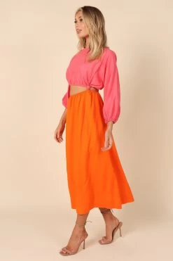 | DETAILS Look for the night and make a statement with this striking midi length dress! Boasting an eye-catching color block design, you’ll be sure to turn heads. The round neckline features a button close for added flair, while the mid sleeve is finished off with an elasticised cuff.