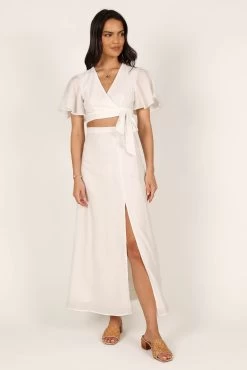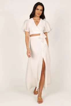 | DETAILS Show off your style in this wrap-style crop top and maxi length skirt set! The top features a flattering v neckline and short sleeves to keep you looking chic and feeling comfortable. An invisible button at the waist with tie close adds an extra fashionable detail.