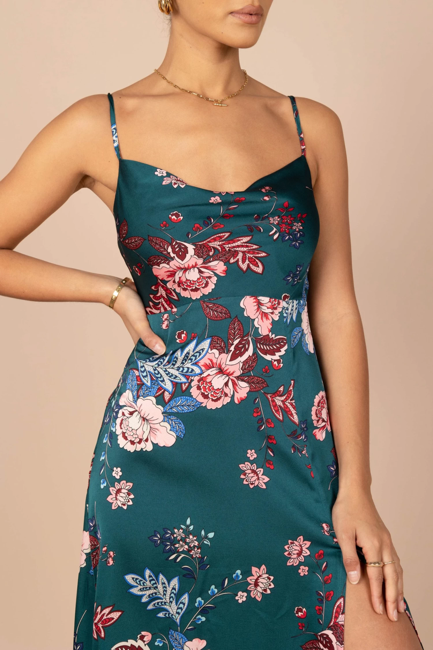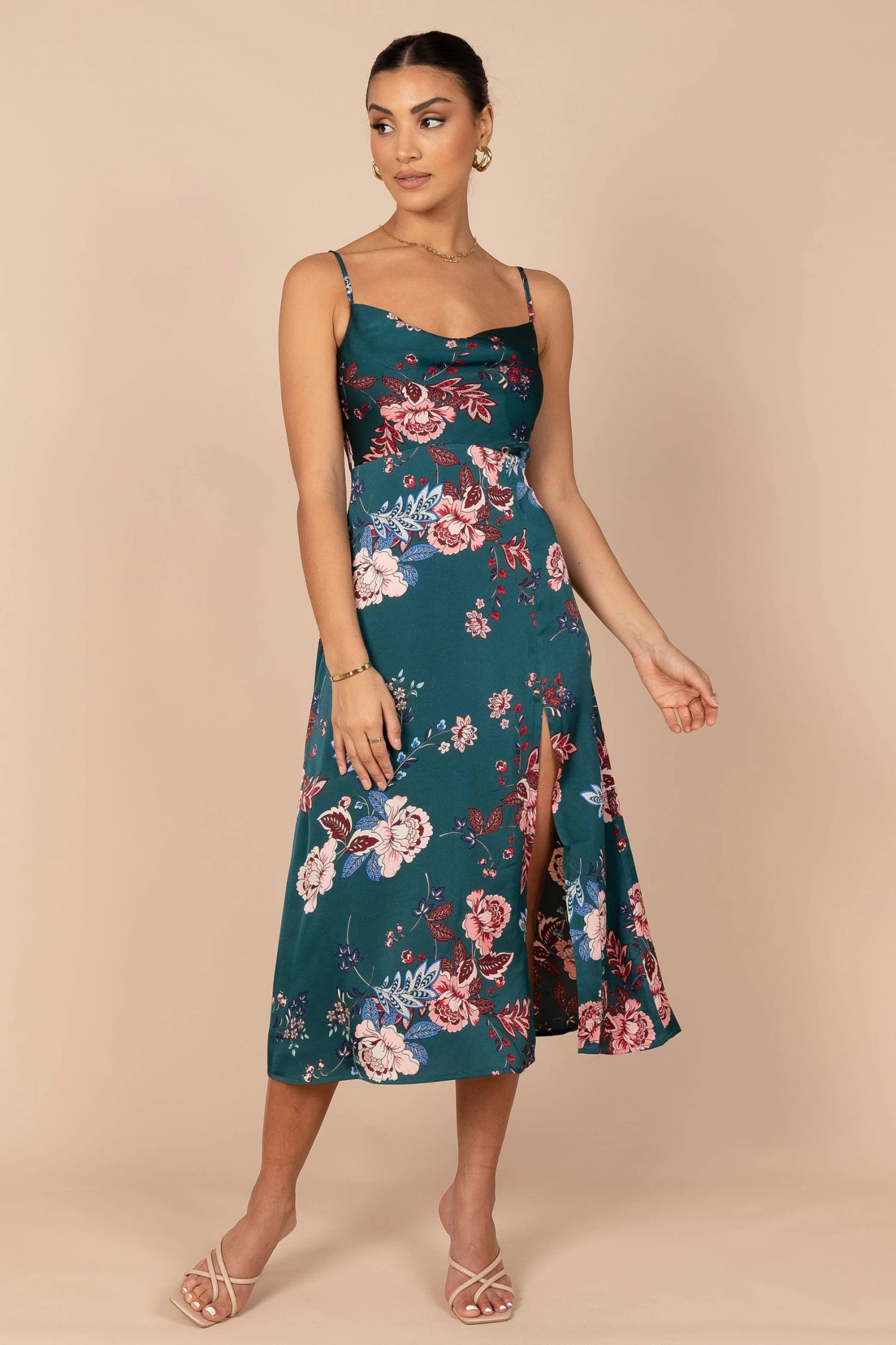 | DETAILS Look no further for the perfect midi dress for your next night out! This midi length beauty has it all: a cowl neckline, thin adjustable straps and a hook and eye clasp. The invisible back zip adds an extra layer of sophistication to this look, along with the front side split for added drama.