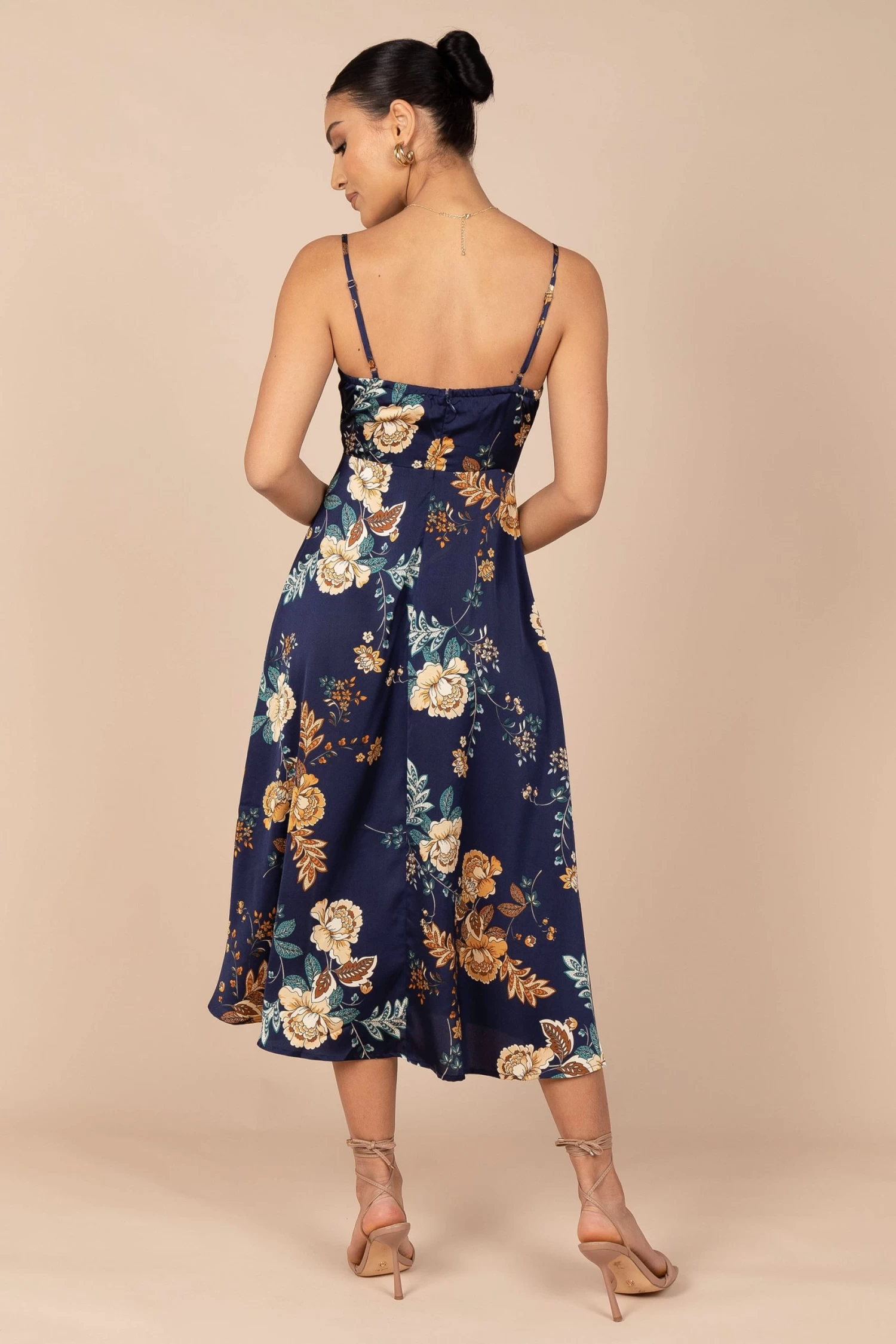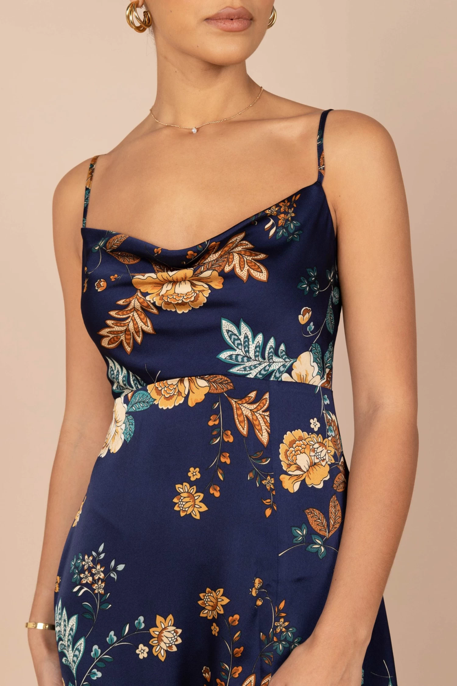| DETAILS This midi length dress is the perfect addition to your wardrobe. With a cowl neckline, thin adjustable straps and hook and eye clasp, it’s both fashionable and comfortable. An invisible back zip offers an easy on/off option while a front side split adds an elegant touch to its design.