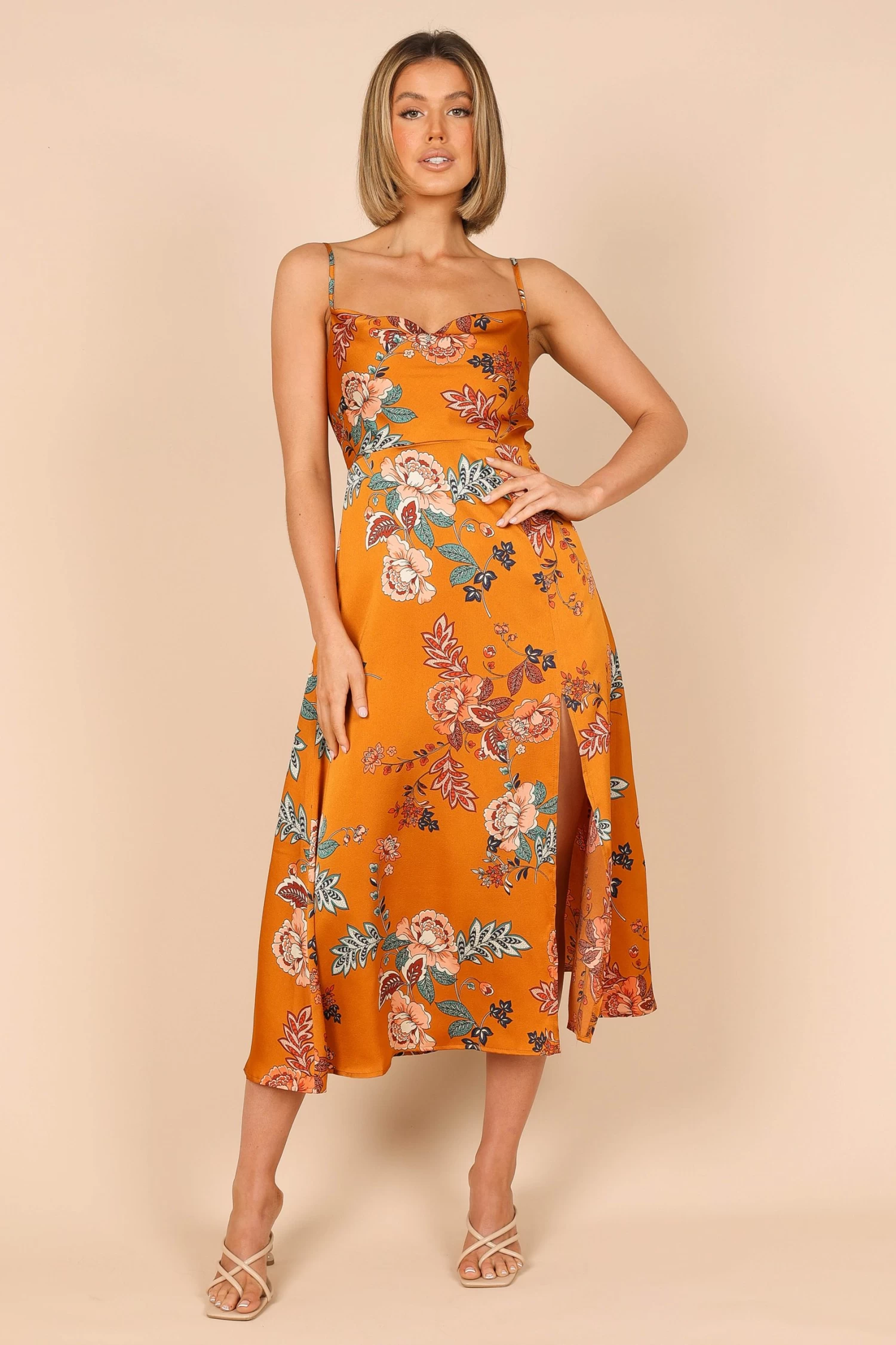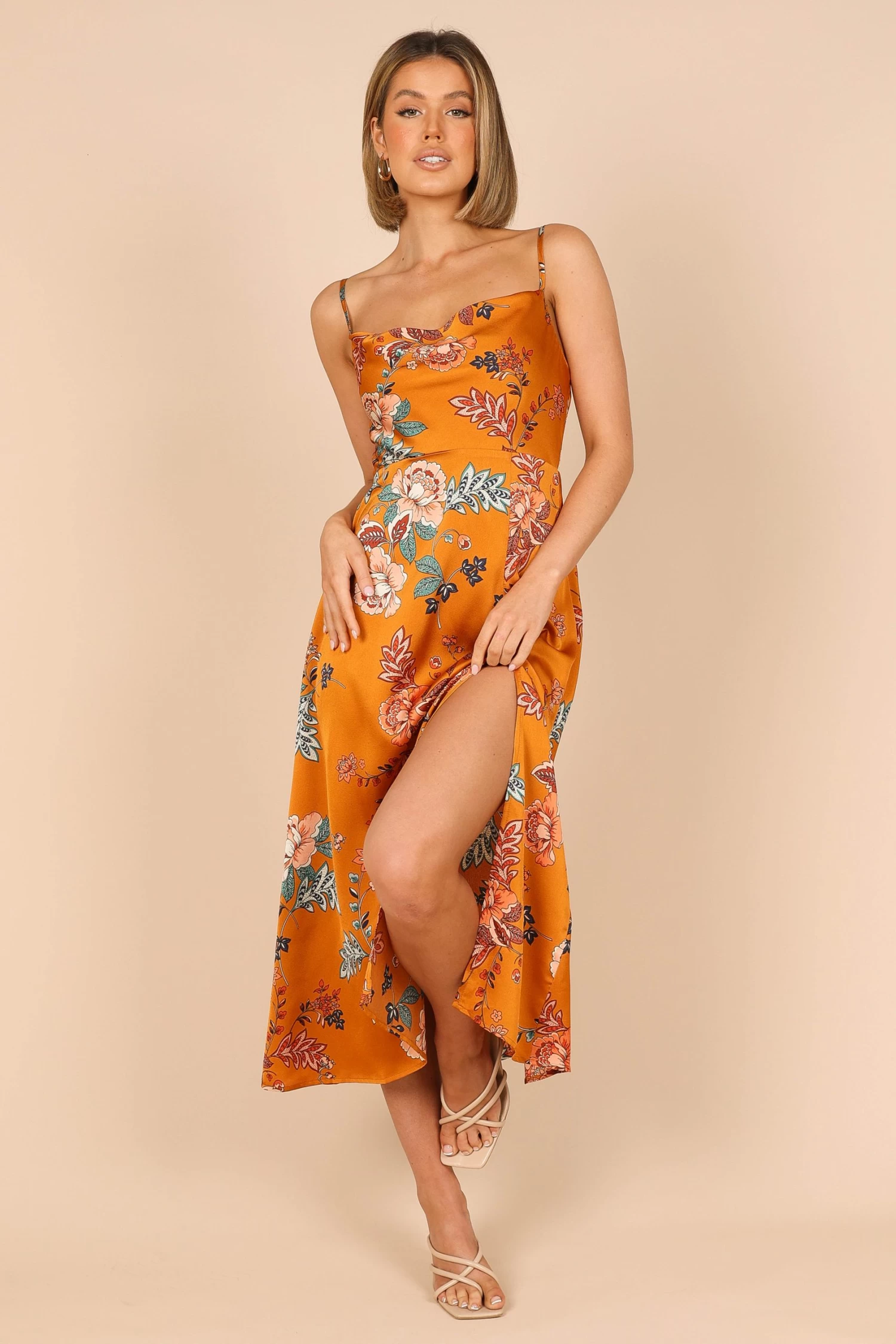 | DETAILS Look no further for the perfect midi dress for your next night out! This midi length beauty has it all: a cowl neckline, thin adjustable straps and a hook and eye clasp. The invisible back zip adds an extra layer of sophistication to this look, along with the front side split for added drama.