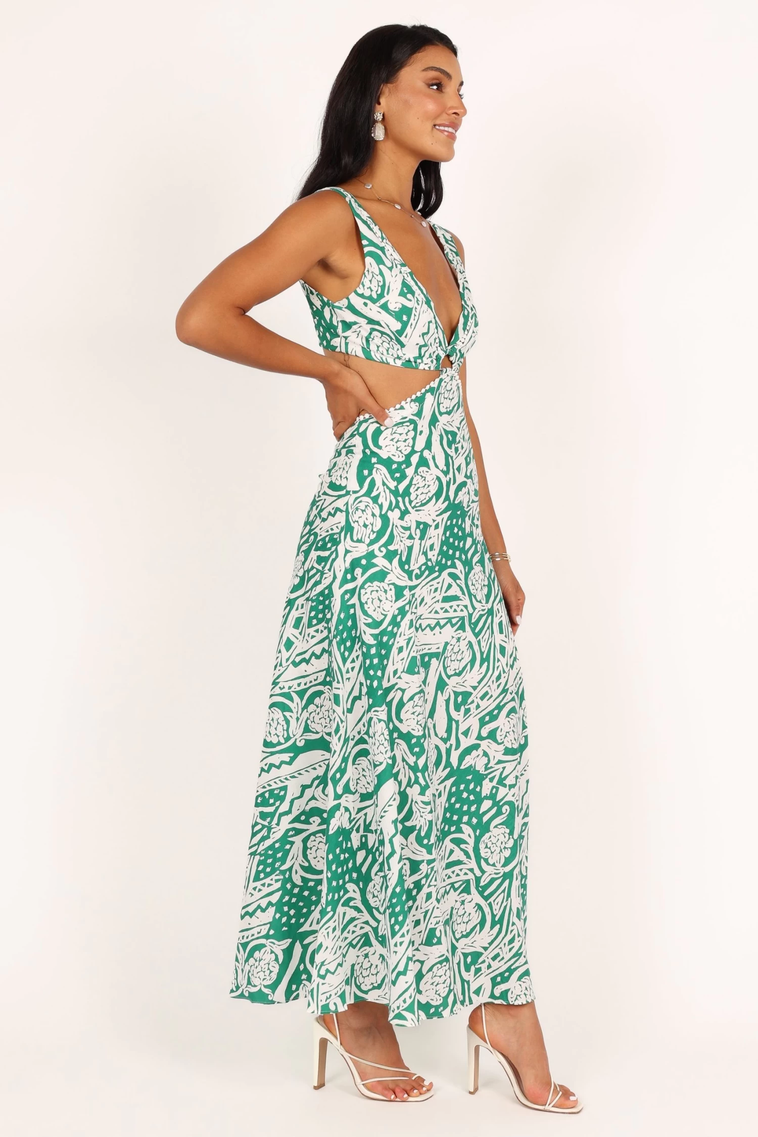 | DETAILS Make a statement this season with our gorgeous maxi length dress. Featuring a flattering v-neckline and front ring detail under the bust, you’ll love the cut out feature that adds an exciting edge.