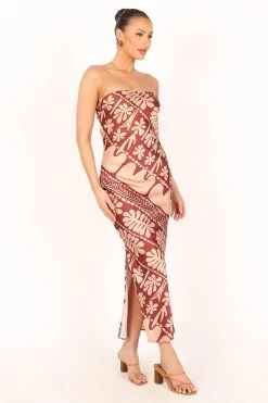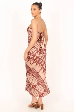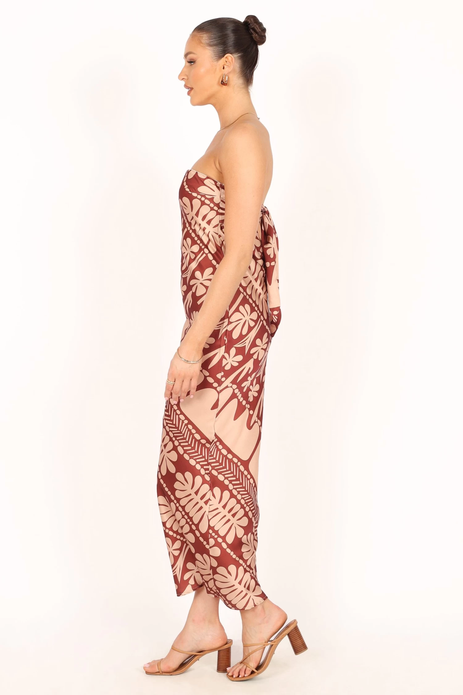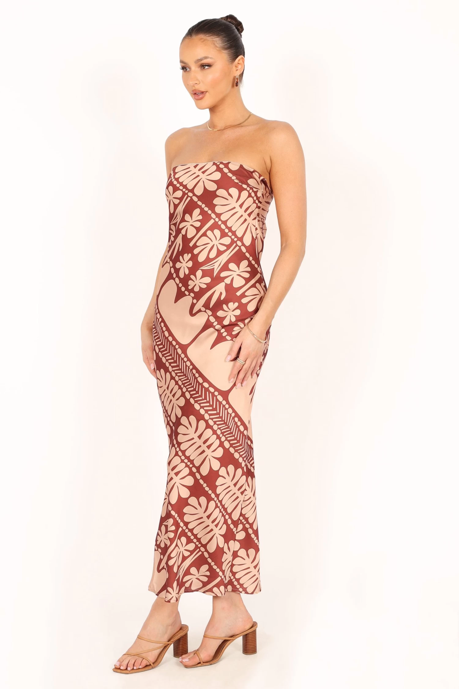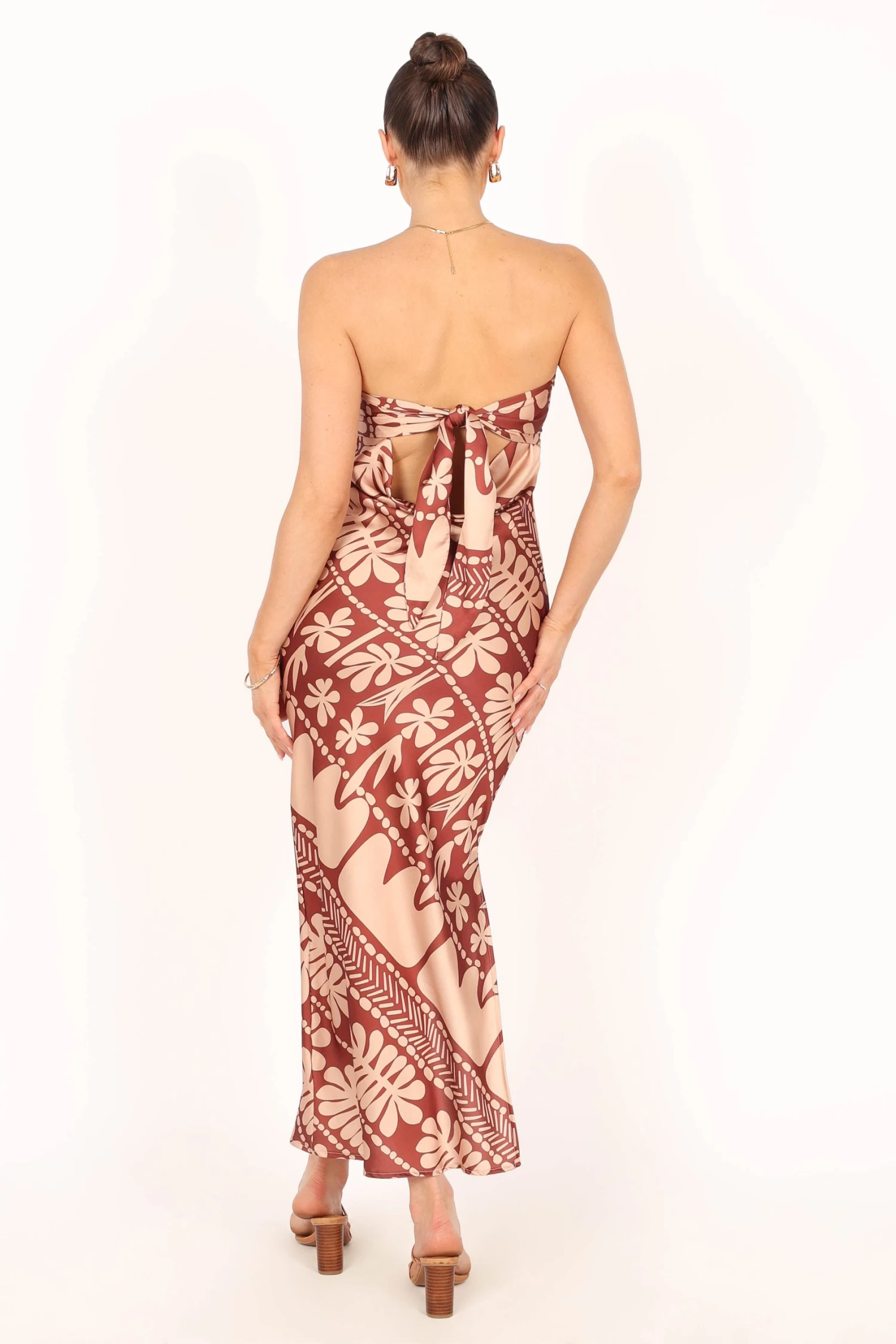| DETAILS This season, make a statement in our beautiful strapless maxi dress! The perfect combination of sweet and sassy, this eye-catching piece features a straight neckline and an open cowl back with tie closure.