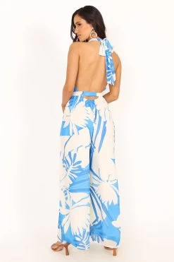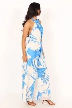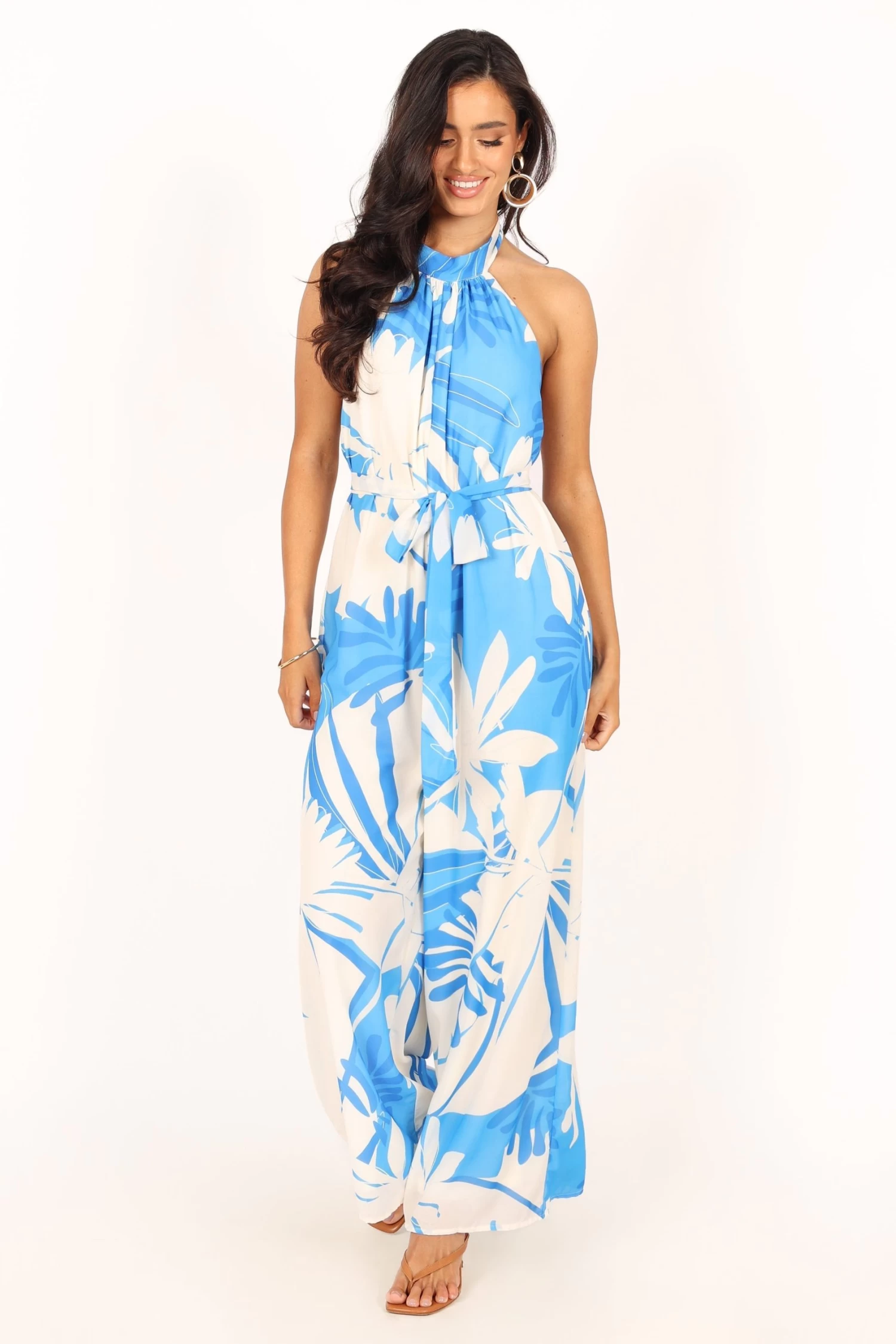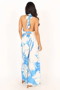| DETAILS Are you looking for a jumpsuit that is stylish and comfortable at the same time? Look no further than this beautiful blue floral jumpsuit! The halterneck neckline with tie close ensures an effortlessly chic look, while the open back feature adds a touch of femininity.