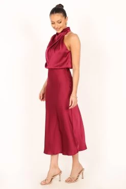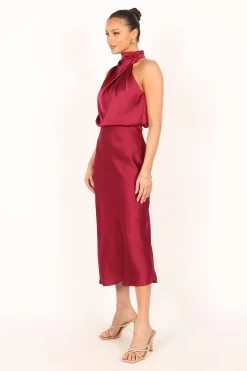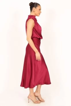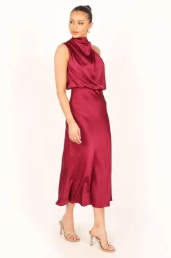| DETAILS Look and feel your best in this stunning event wear dress! Featuring a midi length, an asymmetric high round neckline with gathered pleat detail, plus a back neck opening with button close, it’s the perfect party dress for any special occasion. Not only does it look fabulous, but it feels as good as it looks too‚ crafted from a soft satin feel just for extra comfort.