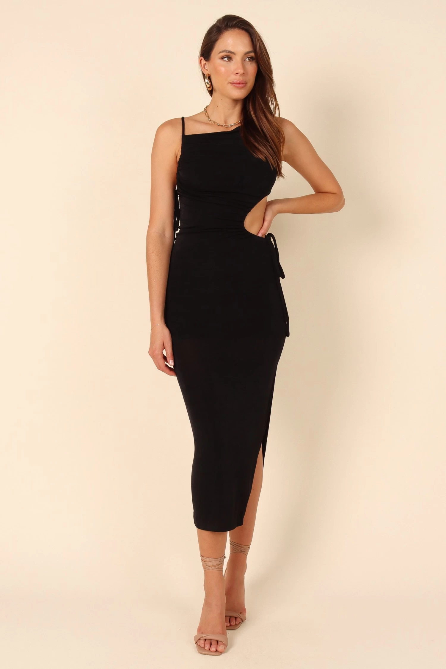 | DETAILS Ready to make a statement? Look no further than this show-stopping maxi dress! Crafted with a unique cowl neckline, left shoulder drawstring tie close and side cut out detail, you’ll love its perfect balance of flattering and chic.