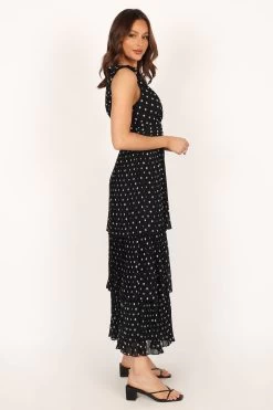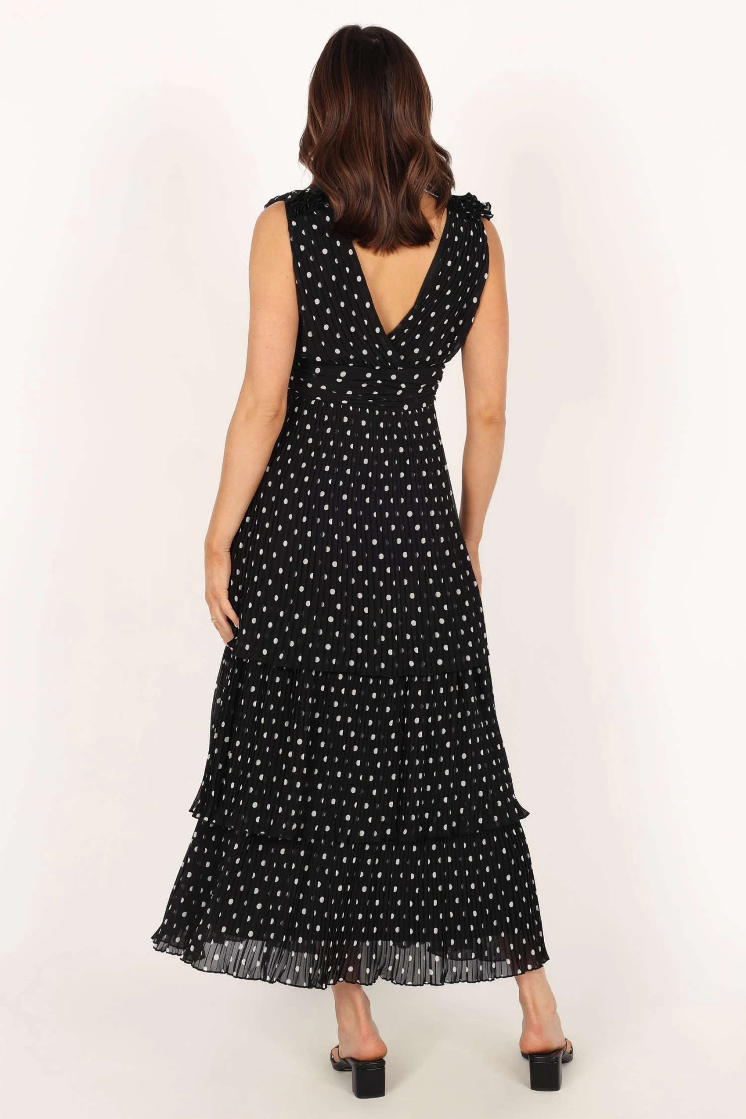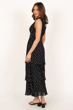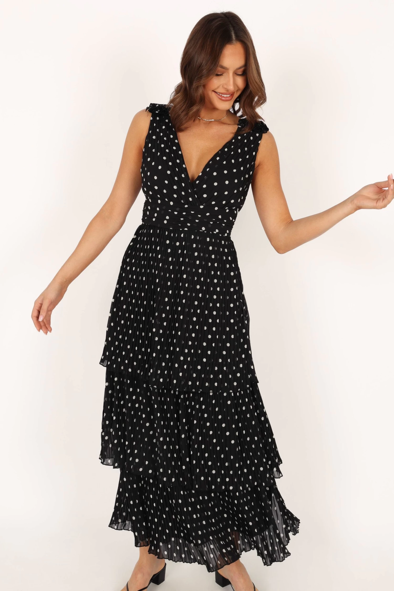 | DETAILS Make a timeless statement with this stunning black and white polka dot maxi dress. Featuring a crossover neckline, non adjustable straps with ruffle detail, gathered bodice feature and invisible side zip with hook and eye clasp, this dress is perfect for any special occasion.
