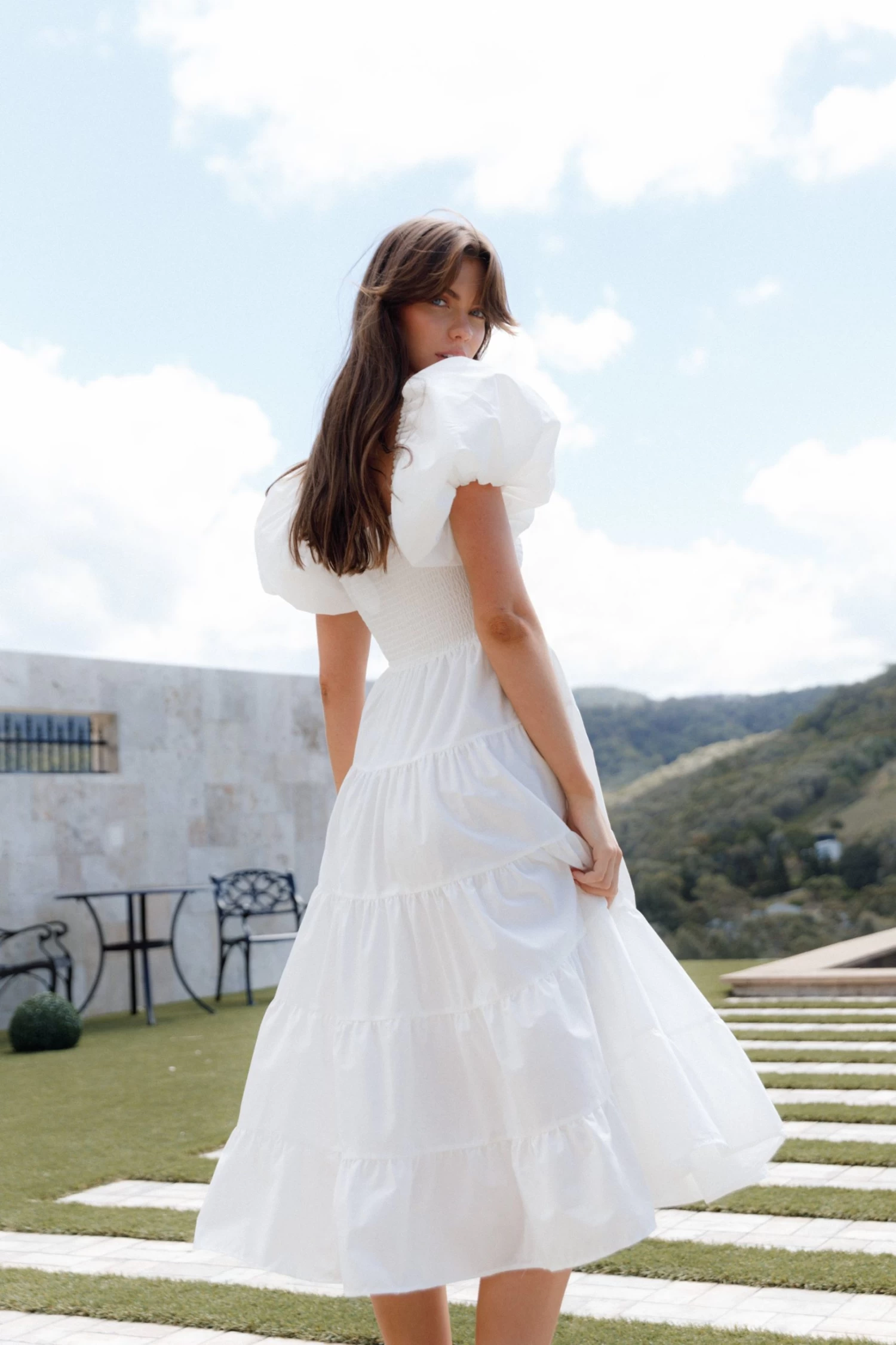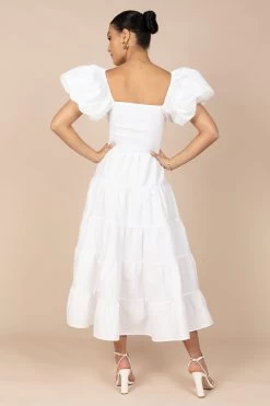 | DETAILS Make a statement with this beautiful smocked midi dress. Cut to a midi length and designed with a square neckline, short puff sleeves with elasticised cuffs, shirred bodice and drop tier a-line skirt design – all in an ultra-flattering relaxed fit adding to its easy-to-wear charm.