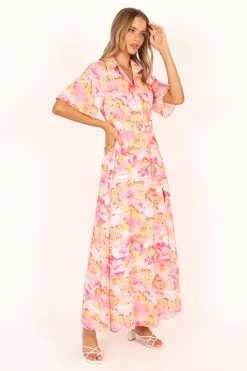 | DETAILS This season, make a statement with our stunning maxi length dress. Featuring a collared neckline and partial button down front, this piece is sure to become a go-to in your wardrobe. The short sleeves create an on-trend silhouette that looks great day or night. For even more style points, the removable belt with buckle detail adds a touch of sophistication.