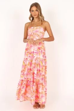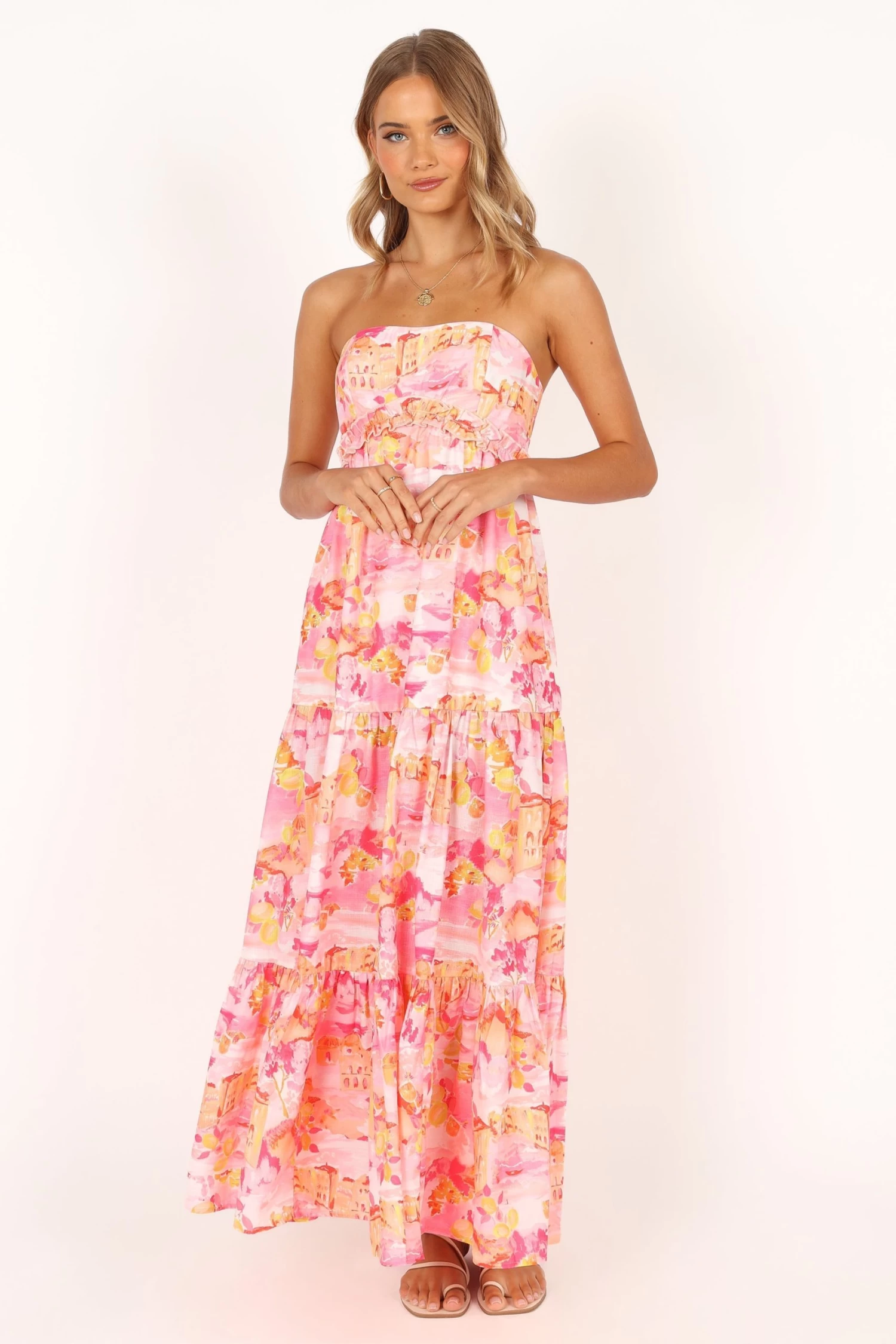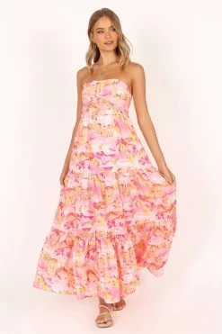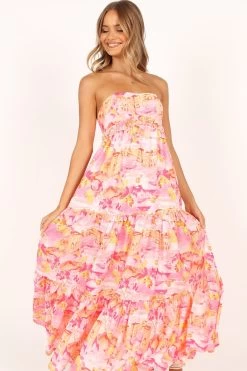 | DETAILS Make a statement in the Maxi Length Dress! This gorgeous dress is sure to make you stand out with its stunning strapless style, straight neckline and ruffle detail under bust. The drop tiered skirt design has added movement while the beautiful watercolour print creates a feminine look.