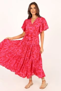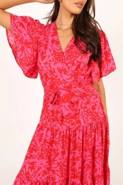| DETAILS The Barker Dress is the perfect outfit for events and everyday, in a stunning midi length with a v-neckline, ruffle sleeves, and a waist tie detailing. Dress it up with heels or go more casual with sandals. The Barker Dress is the ultimate choice for work, party outfits or Sunday errands.