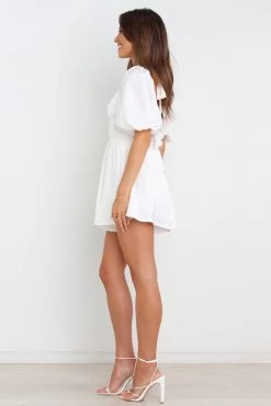 | DETAILS Live your best life in our Above-Knee Length Playsuit! This beautiful white piece features a sweetheart neckline, short sleeves with elasticised cuffs and an open back with tie detailing. The back waistband is elasticised to fit you like a glove, and the invisible zip ensures that it will stay in place.