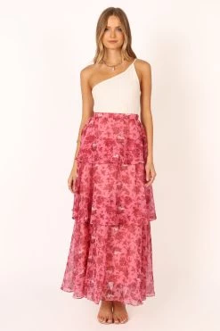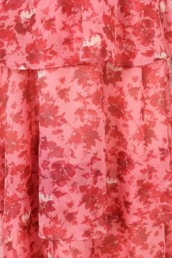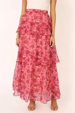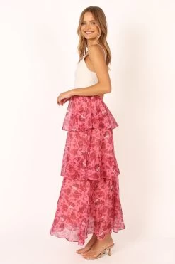 | DETAILS This maxi length skirt is perfect for creating an elegant look. It features a high waisted style with an elasticised waistband for maximum comfort. The drop tiered design gives it a flattering silhouette, and the pink floral print adds a delicate touch of femininity.