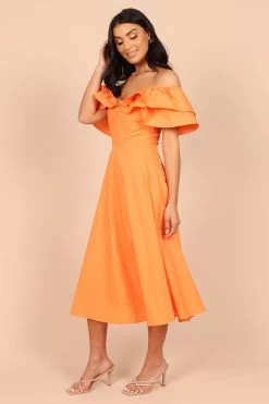 | DETAILS Make a statement in this midi-length V-neck dress with ruffle detail. With short ruffled sleeves, elasticised shoulders and corset boning in the bodice, you’ll look as elegant as can be – all while flaunting your off-the shoulder design!