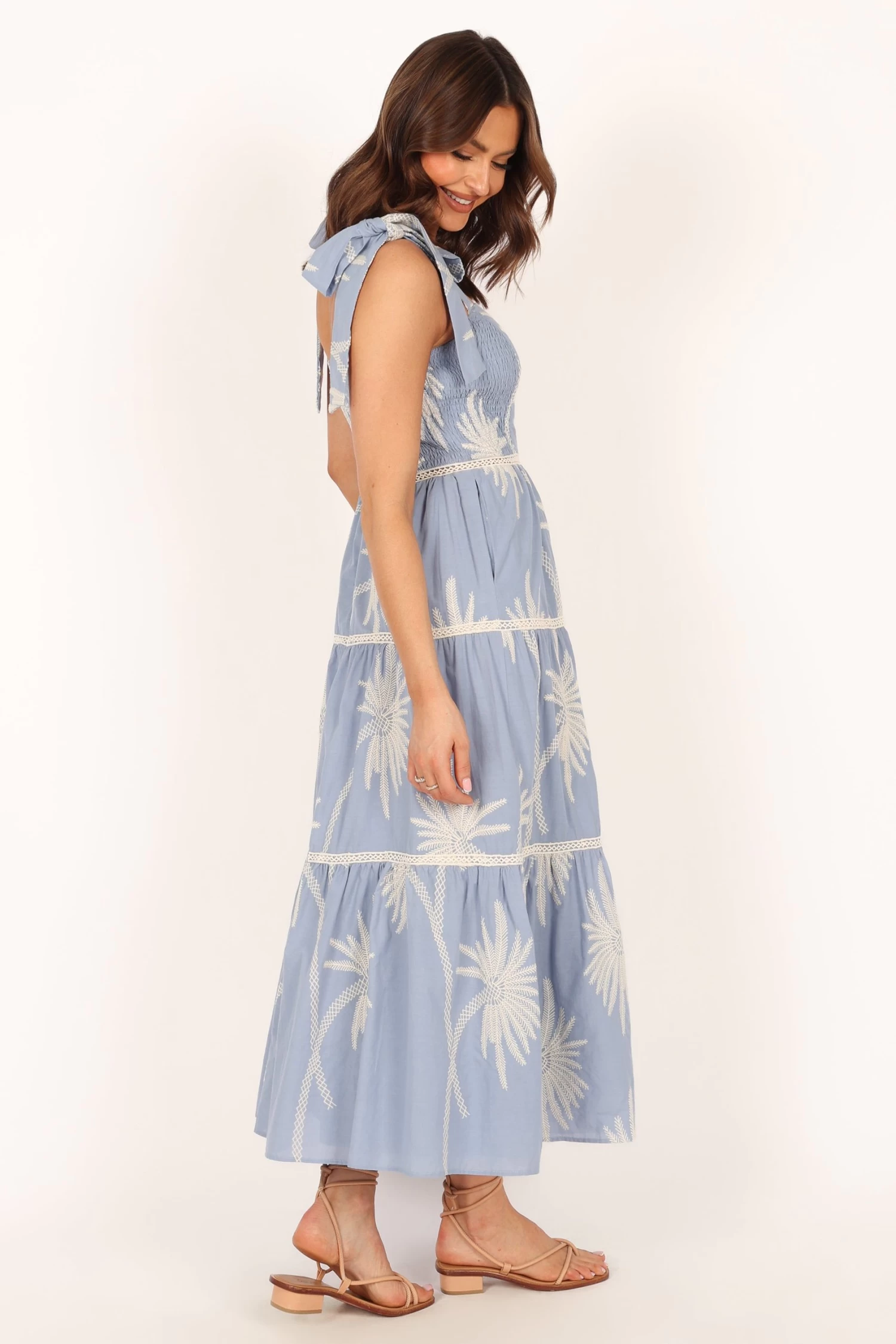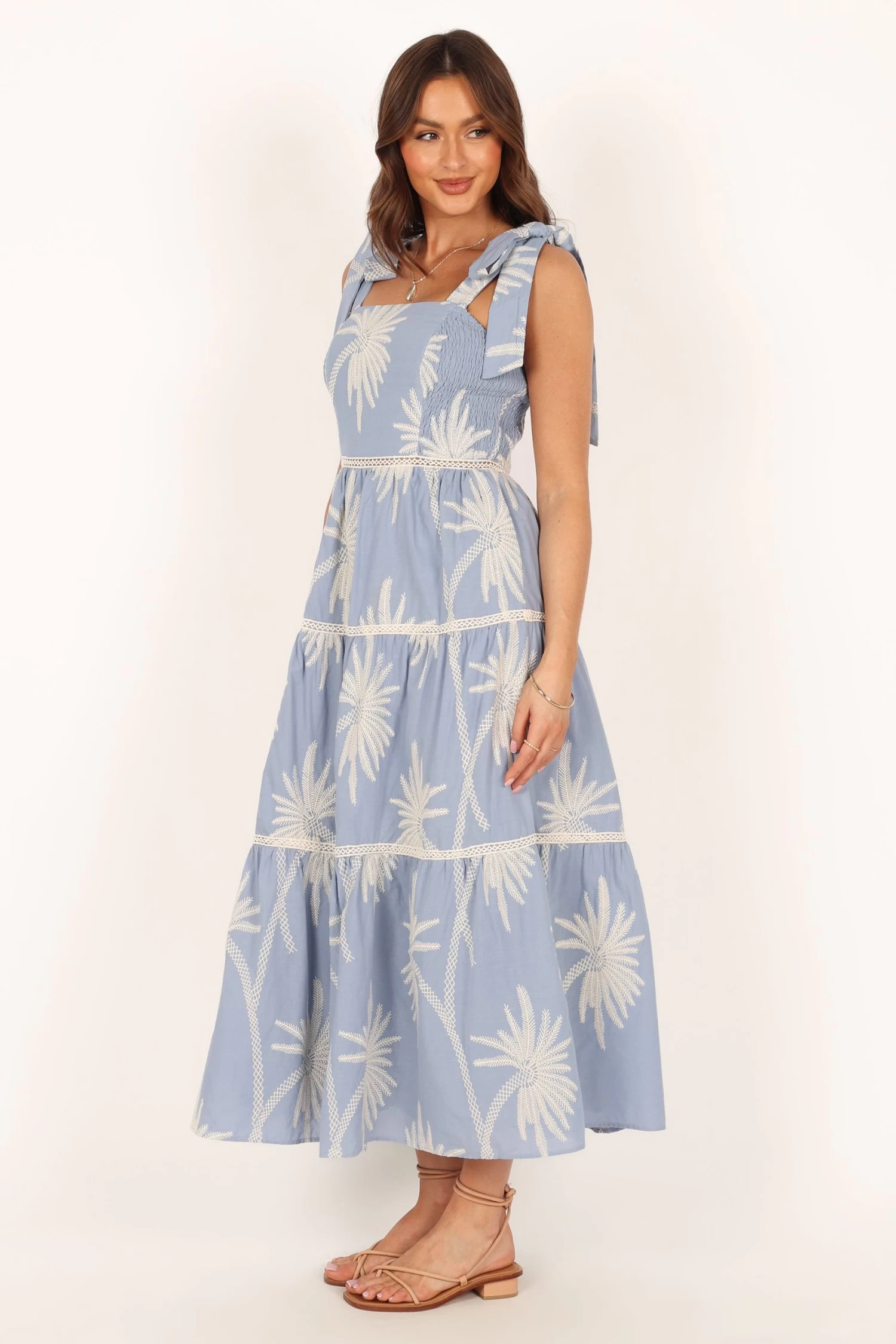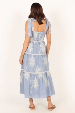 | DETAILS This maxi dress is perfect for your next vacation with its vibrant and eye-catching palm print. The tie-close shoulder straps add a touch of style while ensuring a comfortable fit, and the elasticised bodice ensures you feel both comfortable and secure.