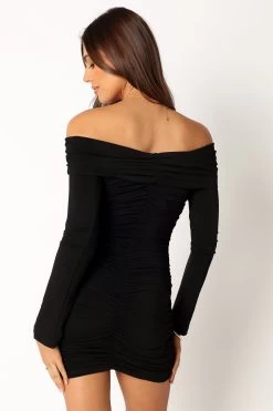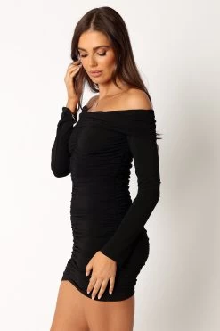 | DETAILS Are you ready to turn heads at your next party? Look no further than this playful off shoulder style mini dress! Not only does it feature a straight neckline with an overlay feature, but also long sleeves with gathered ruched detail.
