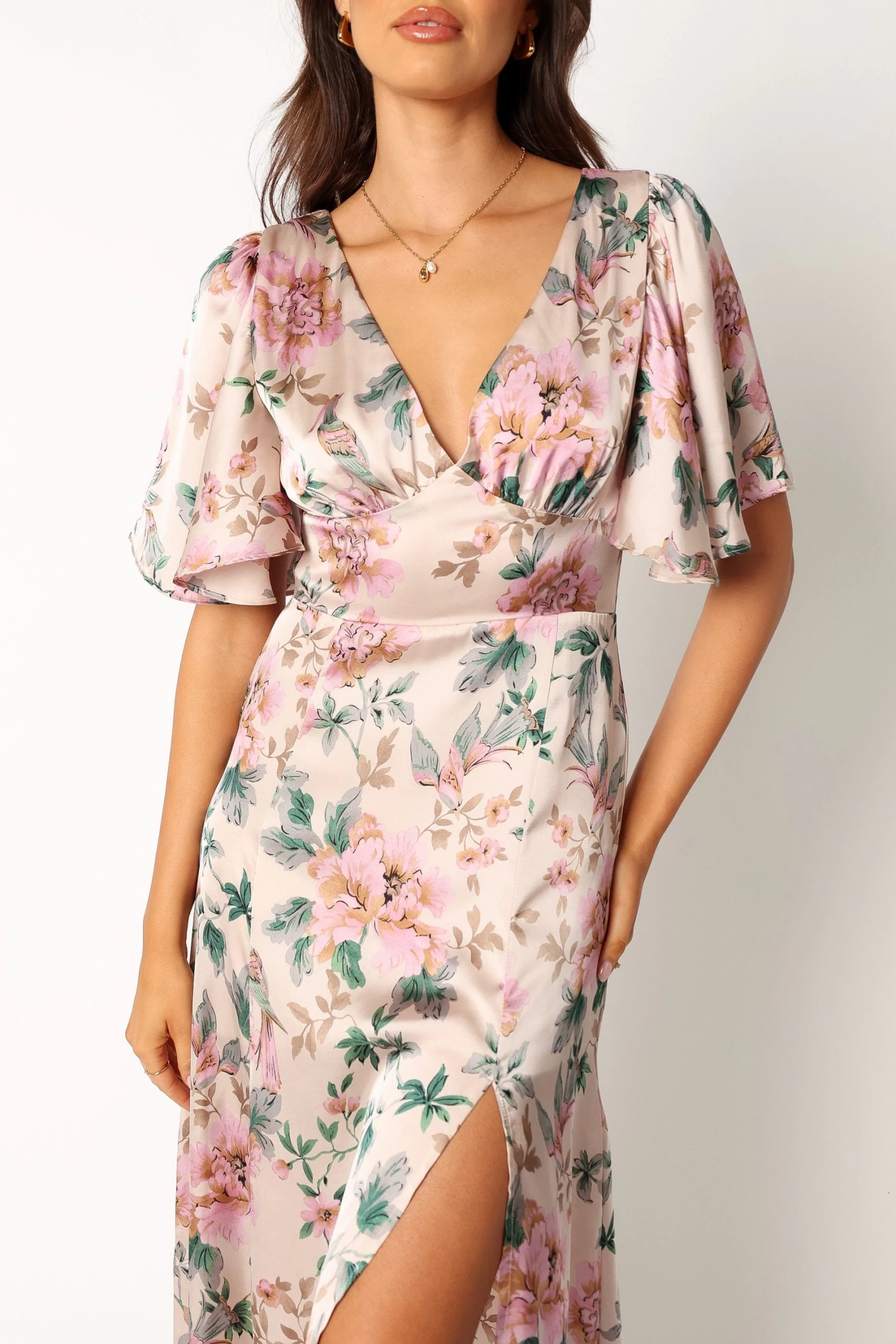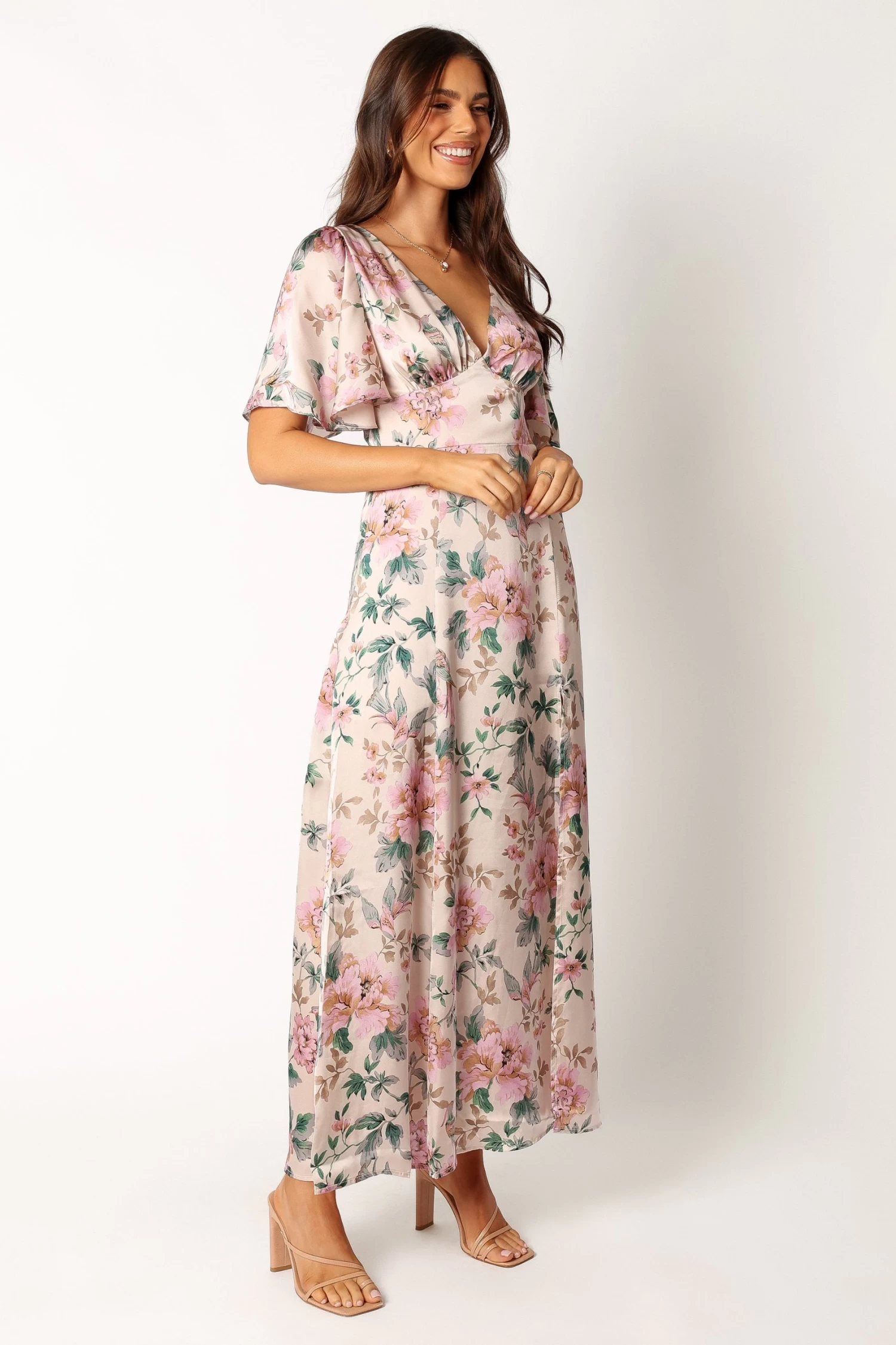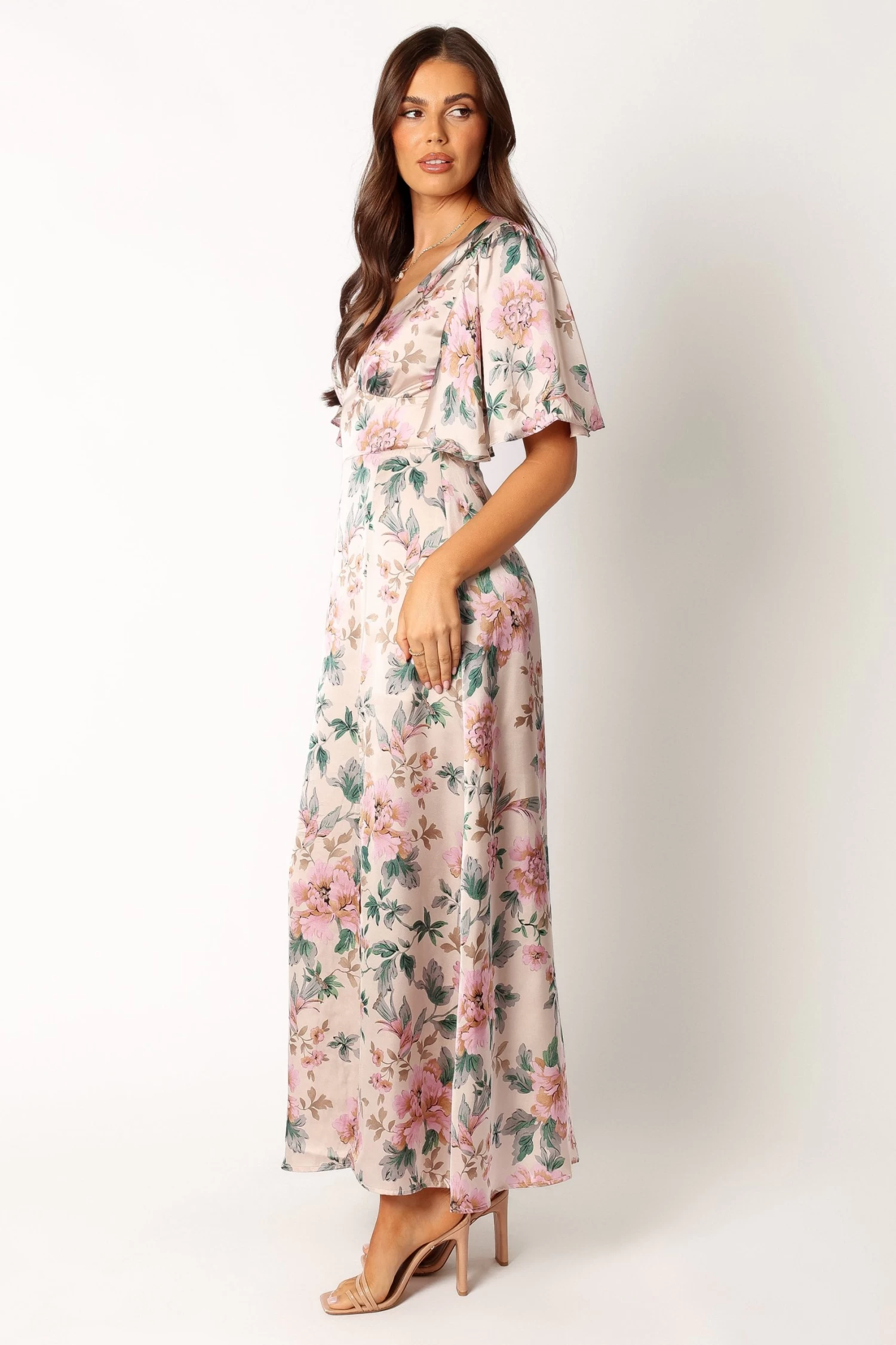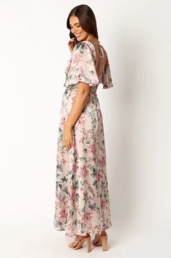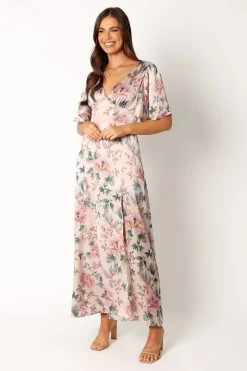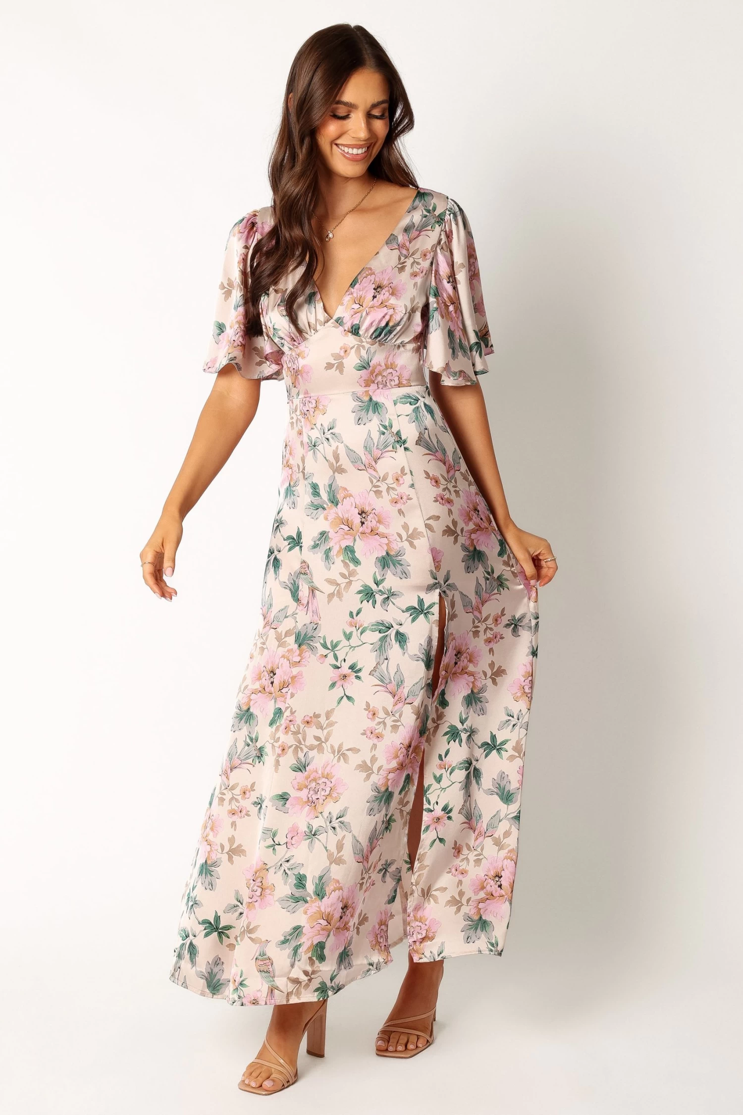 | DETAILS Welcome to the world of stylish maxi dresses! Take your look up a notch this season with our new V-neckline, short sleeve maxi dress. The sophisticated open back is secured with tie closure and boasts an invisible zip for easy access.