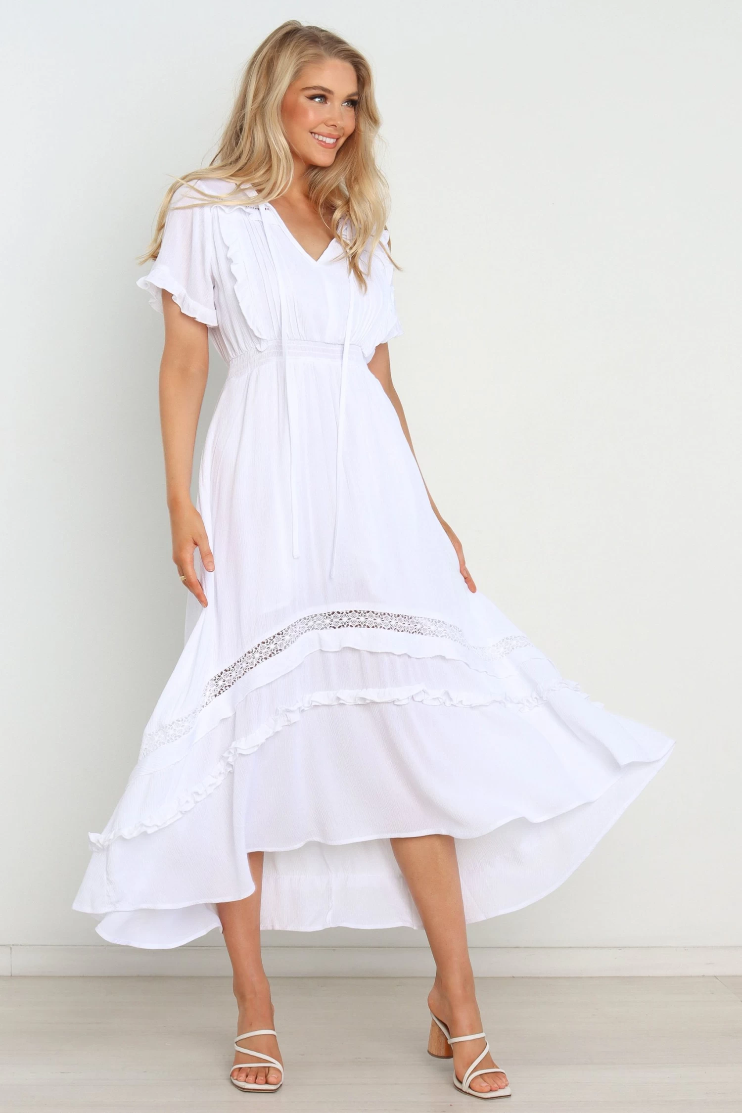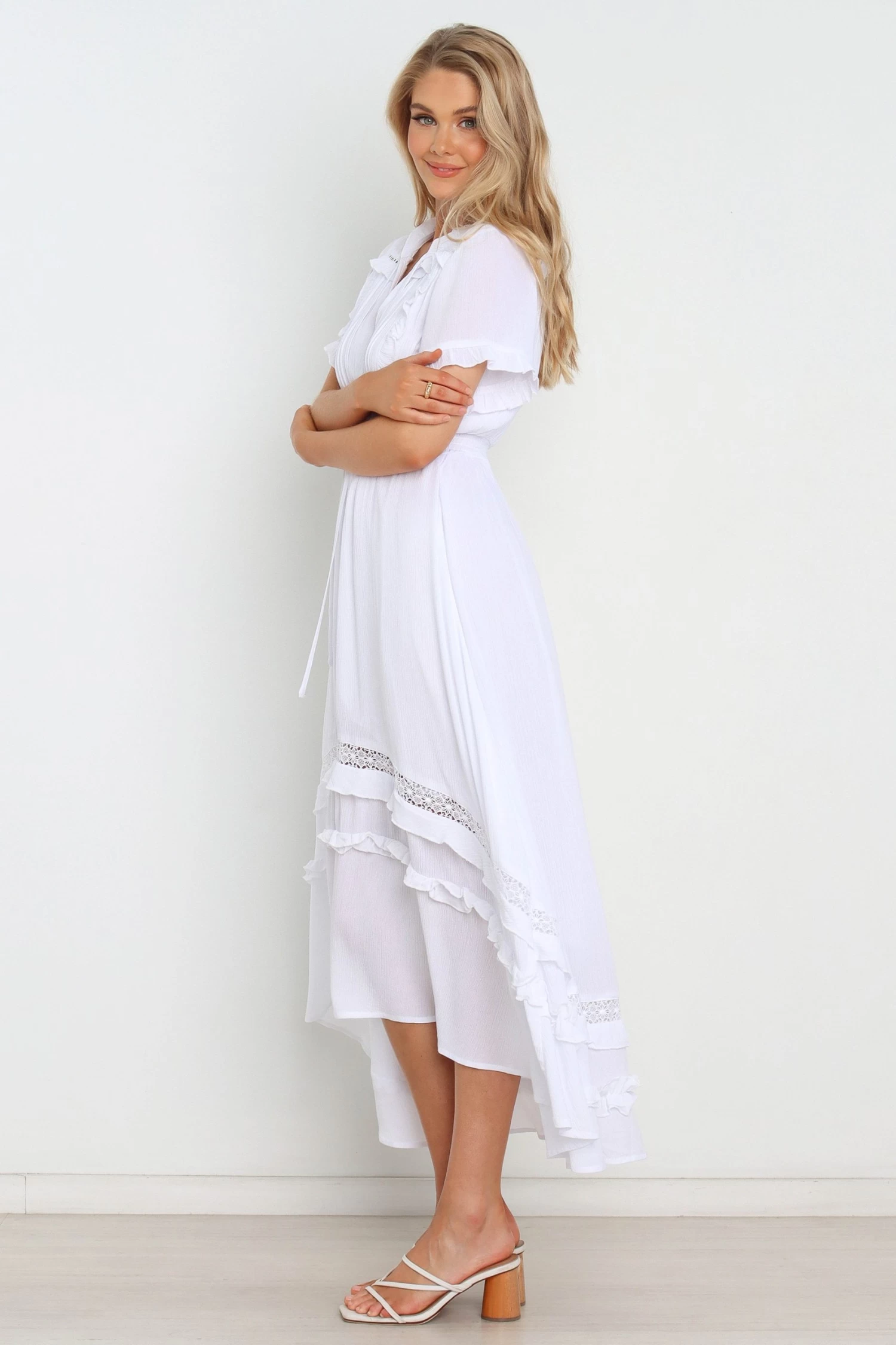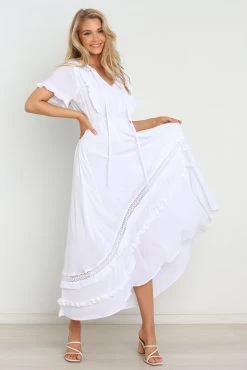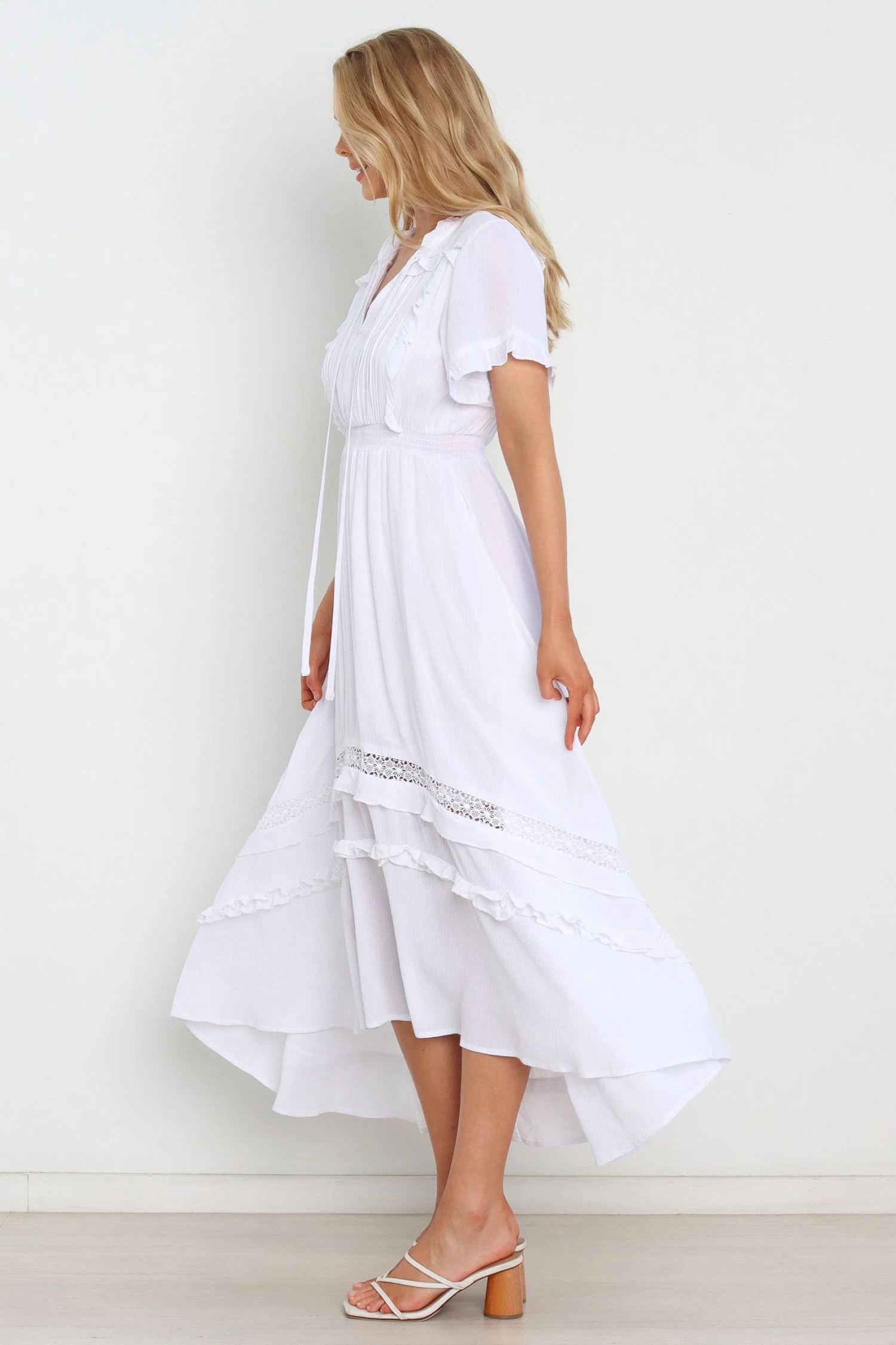 | DETAILS This midi length dress is a showstopper! The v-neckline with ruffle collar detail adds an extra bit of femininity, while the short sleeves provide comfortable coverage. The elasticised waistband ensures a perfect fit, while the pleat and lace trim detail adds a touch of elegance.
