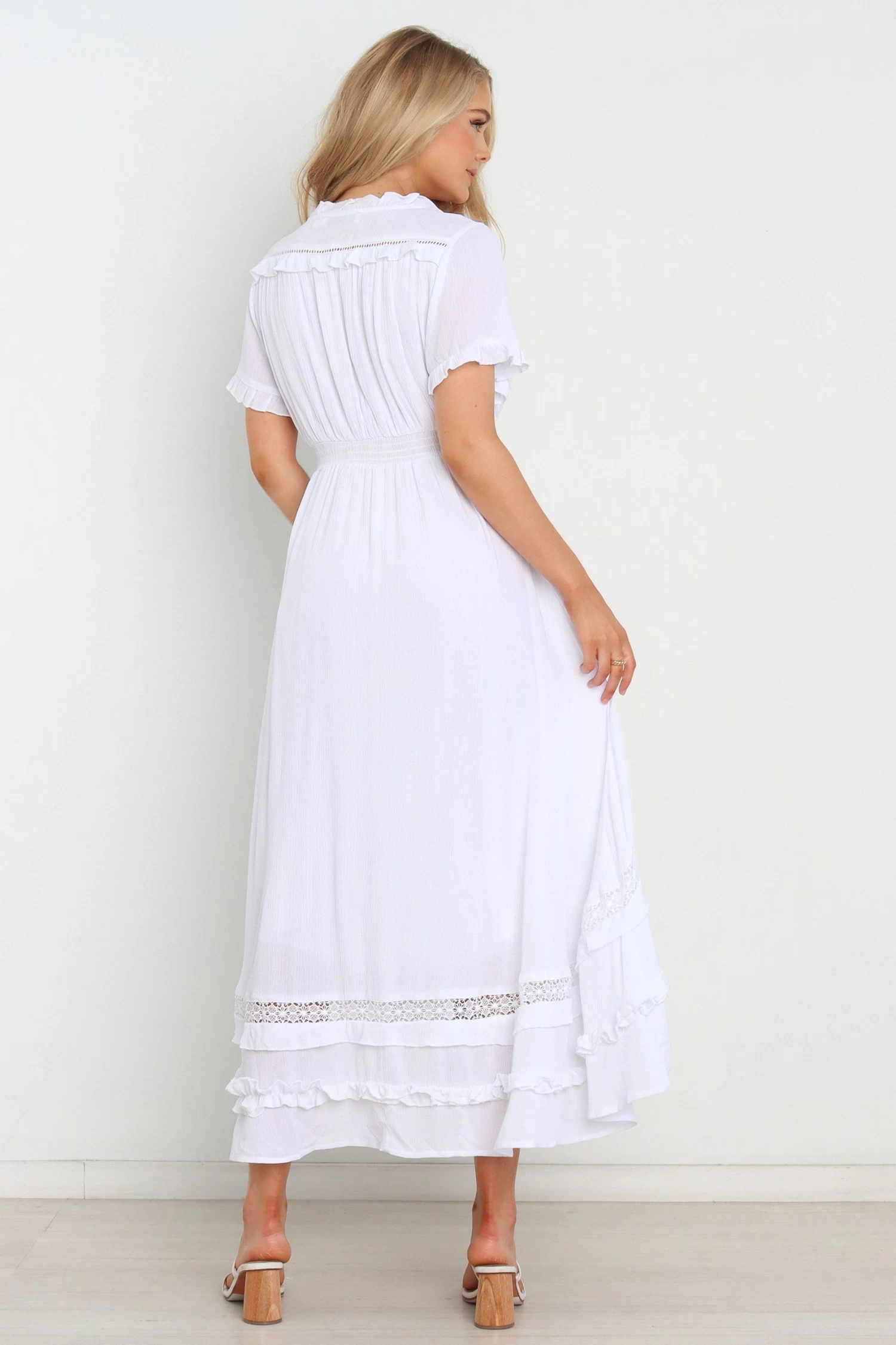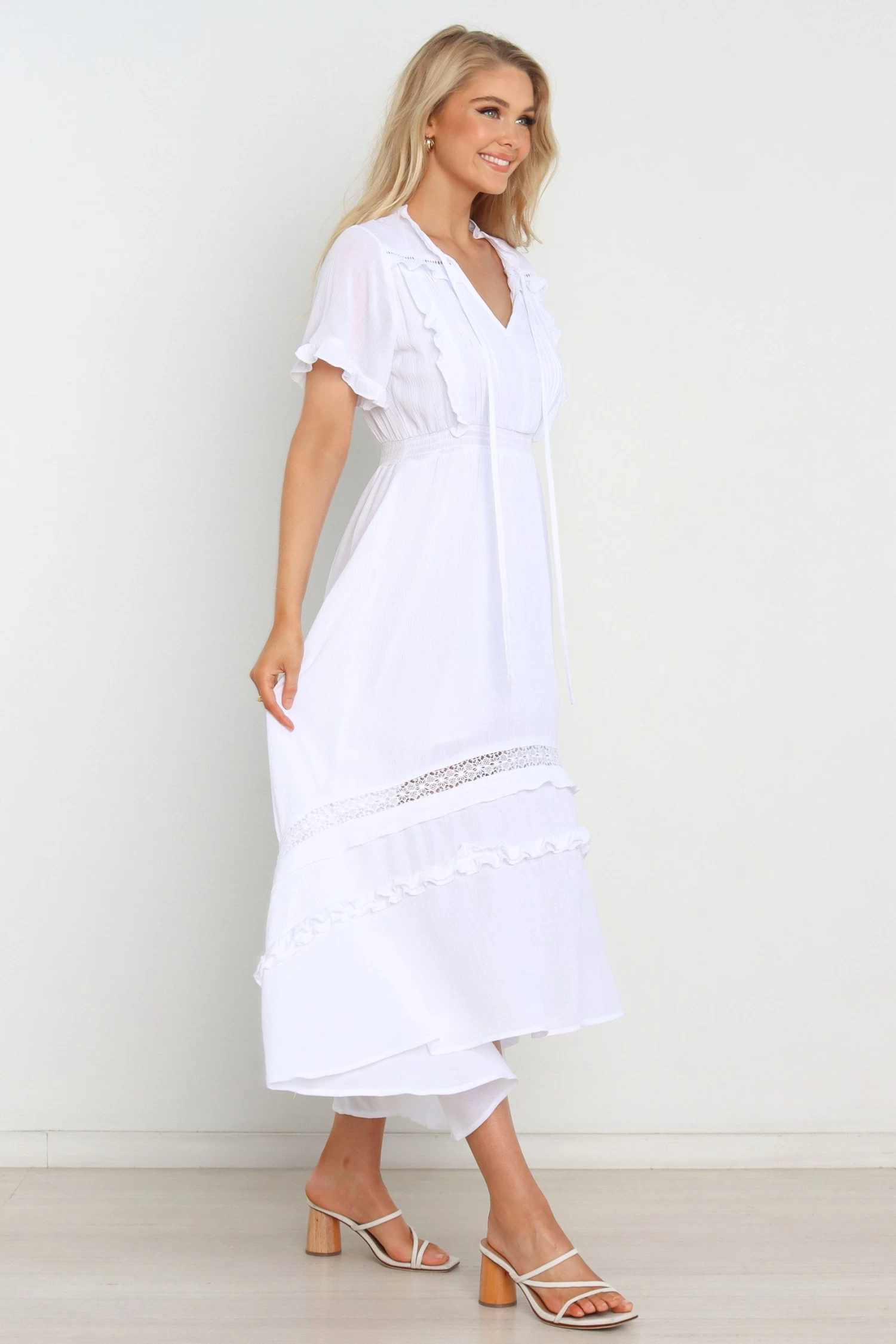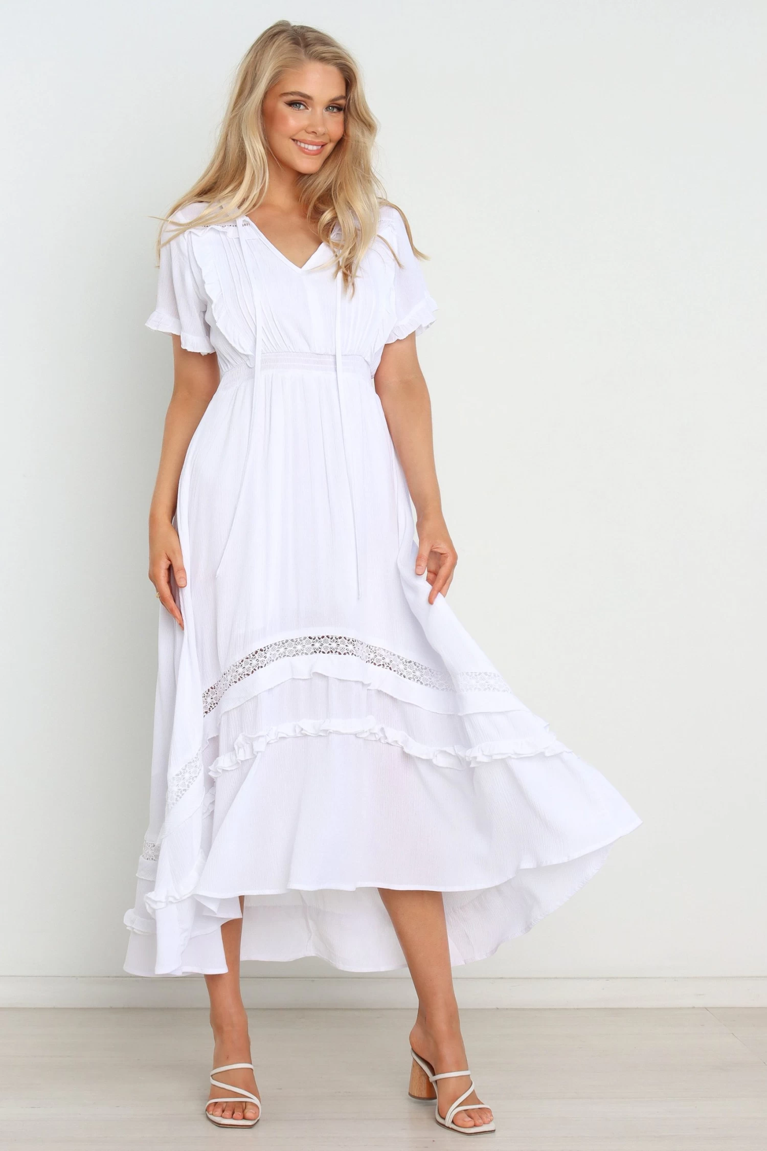| DETAILS This midi length dress is a showstopper! The v-neckline with ruffle collar detail adds an extra bit of femininity, while the short sleeves provide comfortable coverage. The elasticised waistband ensures a perfect fit, while the pleat and lace trim detail adds a touch of elegance.