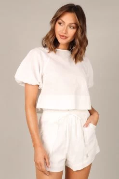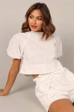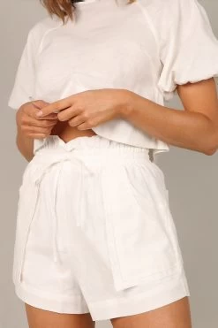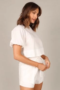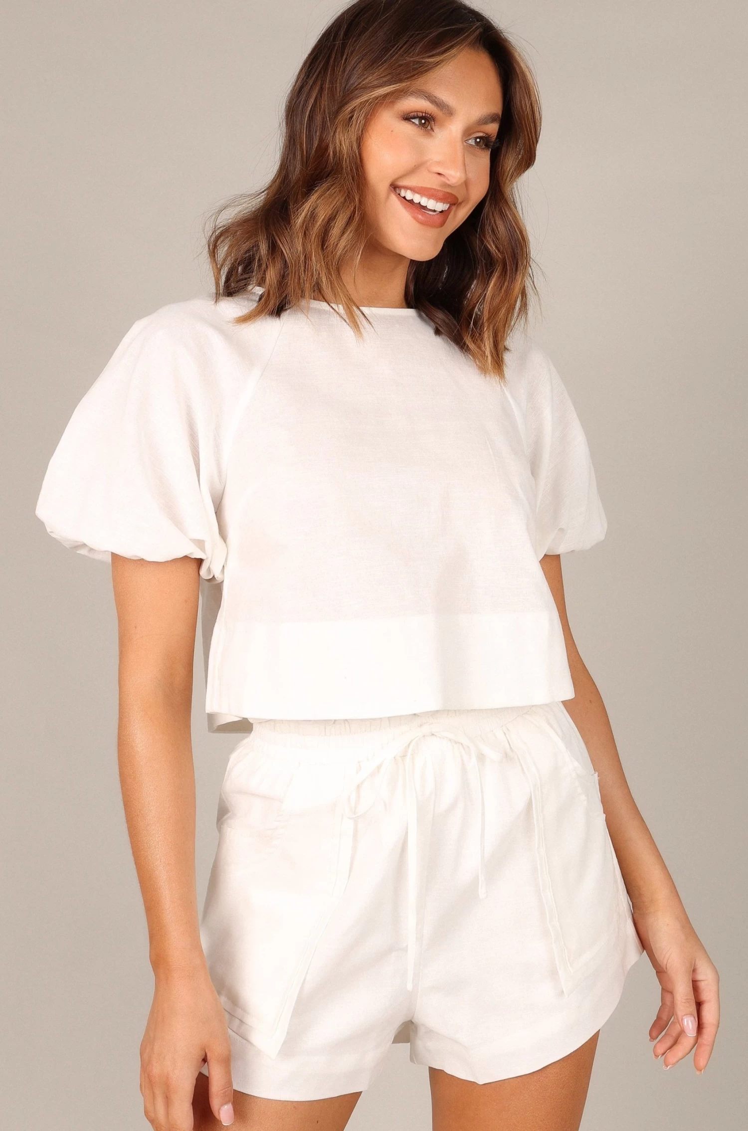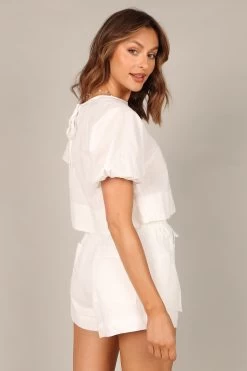 | DETAILS This white matching set is perfect for a fun day out! The cropped length top with short sleeves and elasticised cuffs gives you the perfect fit and the back neck opening with tie close adds a feminine touch. It’s cut in a relaxed fit to keep you comfortable no matter what adventure awaits.