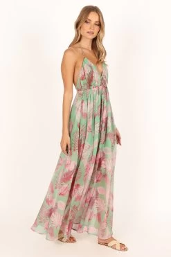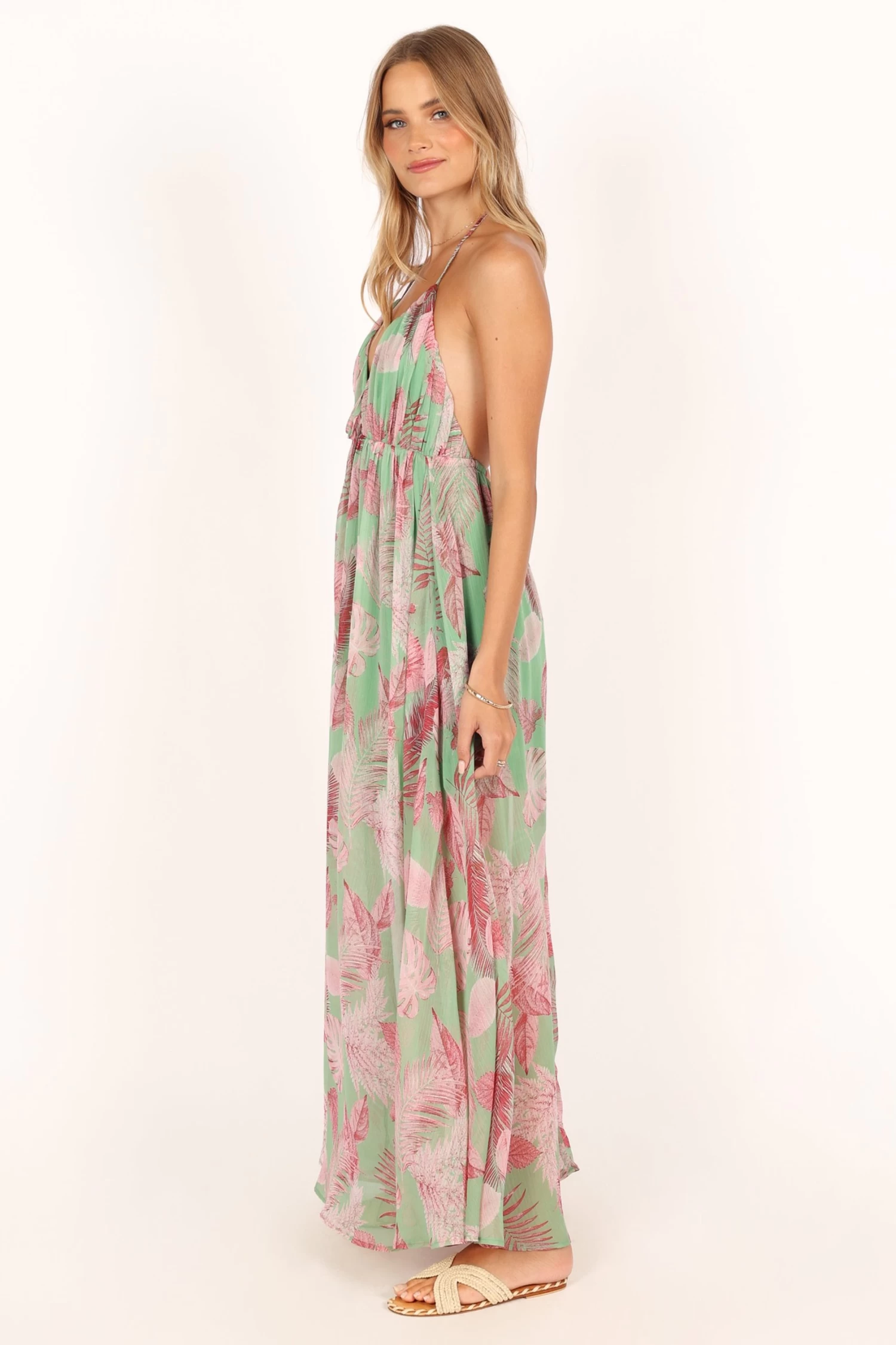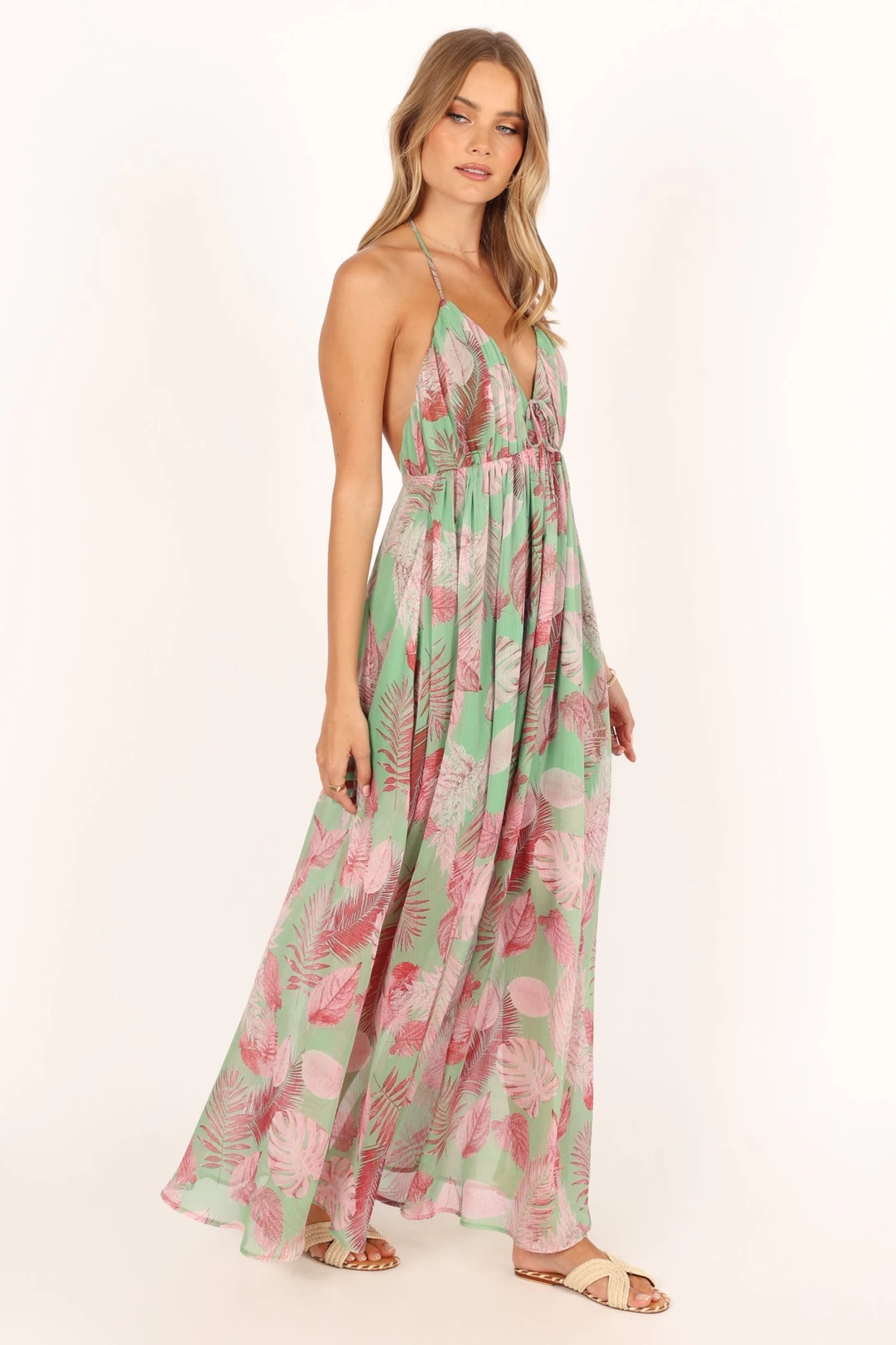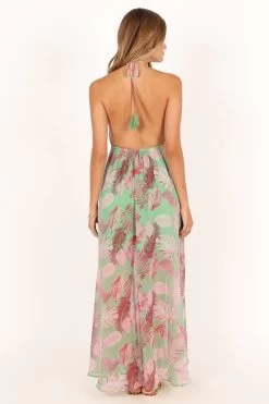 | DETAILS This halterneck style dress features an eye-catching red leaf print that captures the essence of summer beautifully. With a maxi length, this elegant dress offers a flattering V neckline, ensuring you stay comfortable and confident wherever you choose to wear it.