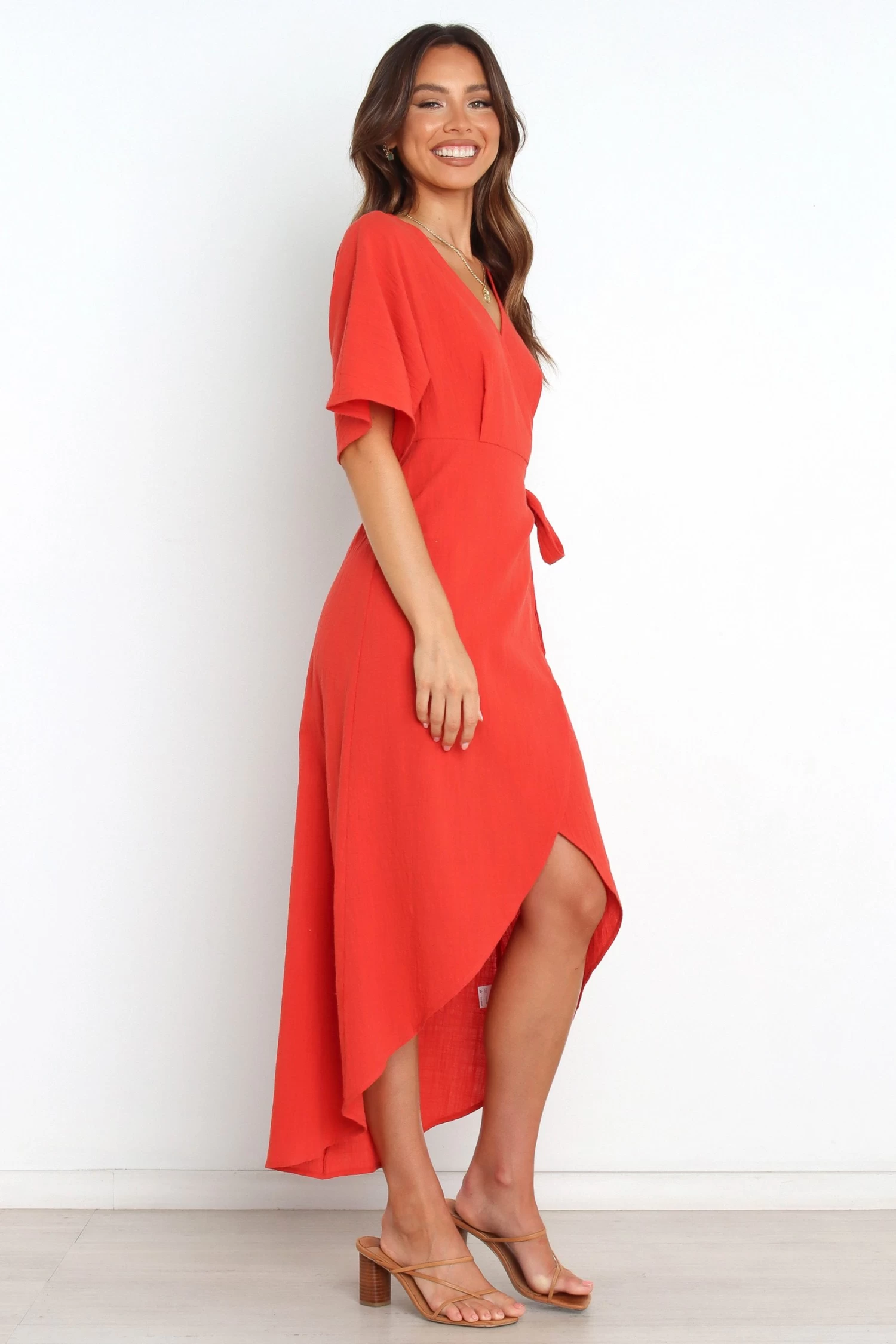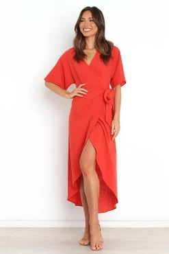 | DETAILS This wrap style dress is perfect for any occasion! It features a midi length skirt and an elegant v overlay neckline. The short sleeves are the perfect balancing touch, while the waist tie adds the ideal finishing detail to this beautiful piece.
