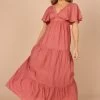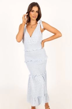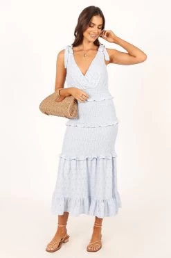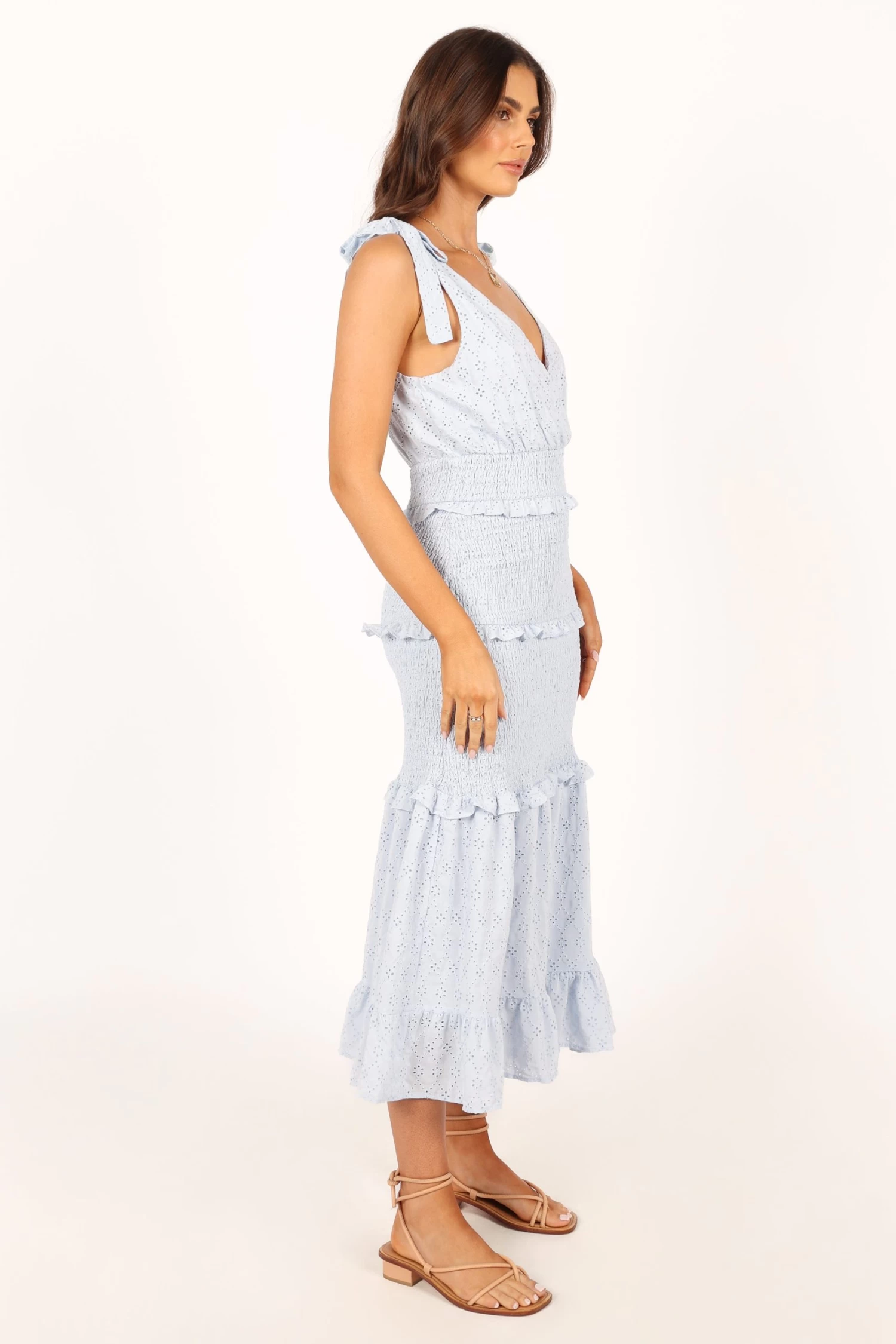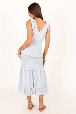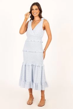 | DETAILS This elegant midi dress features a flattering v neckline and tie-close straps, ensuring a comfortable and adjustable fit for various body types. The elasticised gathering around the waist and hips offers a chic and stylish silhouette while also providing for ease of movement, making this dress perfect for any occasion.