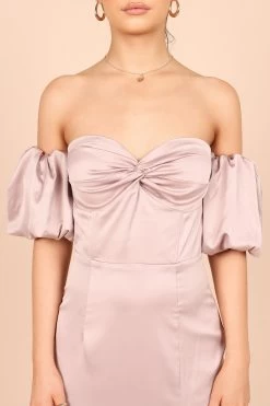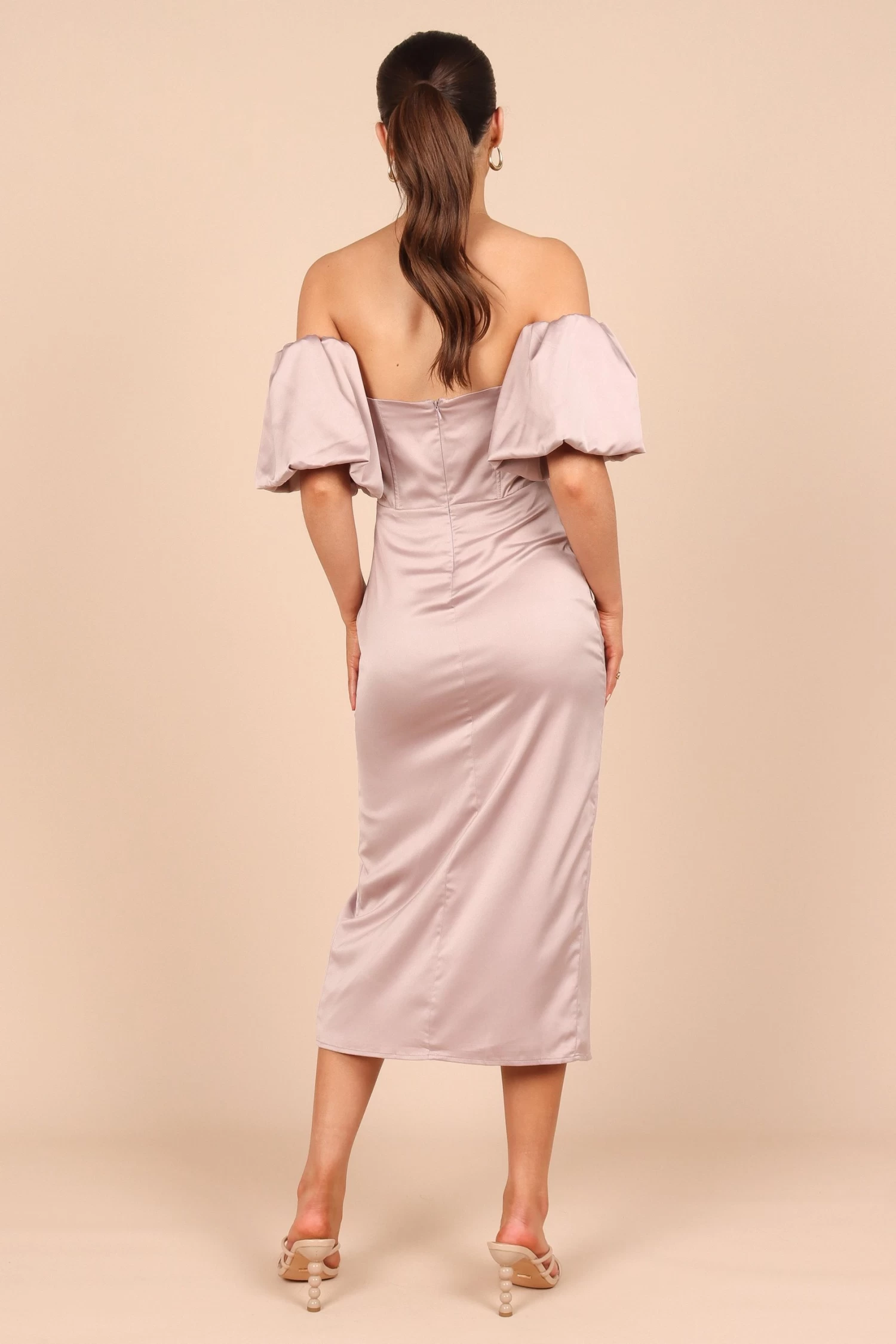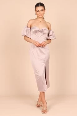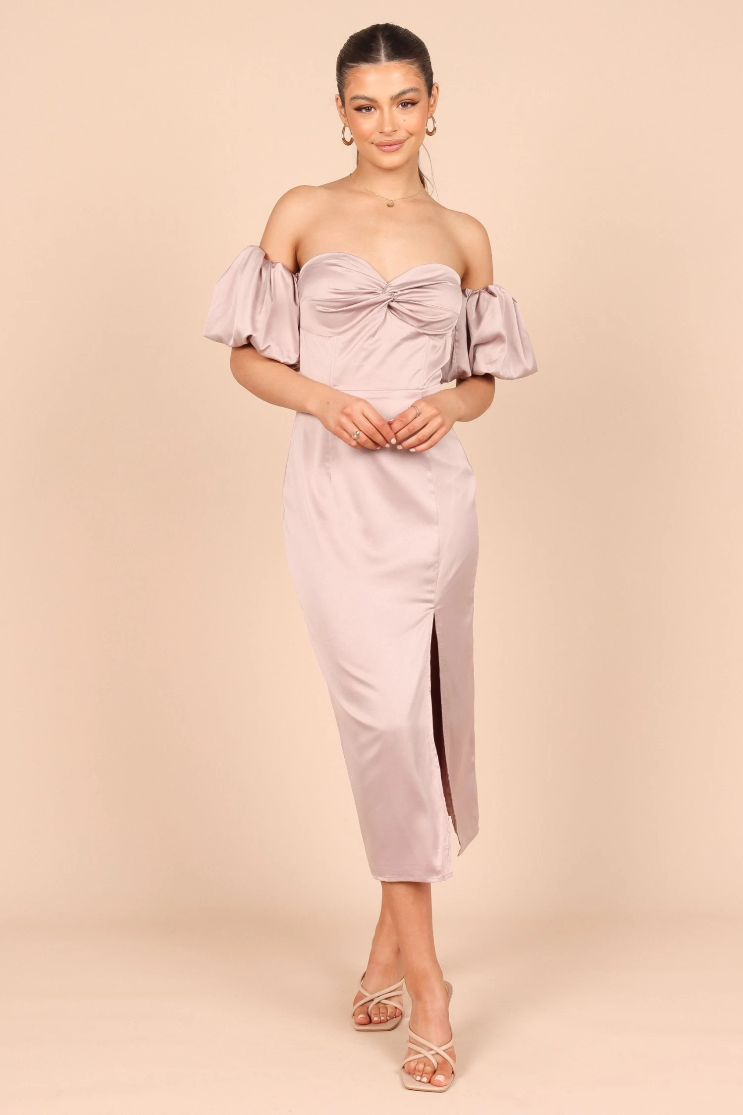 | DETAILS This midi dress is a must-have for any special occasion! The off shoulder style and midi length give a timeless and elegant look, while the front knot feature on bust and bodice boning add a touch of modern glamour. Short elasticised puff sleeves complete the look with an ultra-flirty vibe.