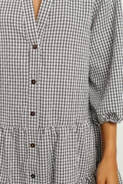 | DETAILS This gorgeous gingham print dress is the perfect addition to your summer wardrobe! Its above-the-knee length and relaxed fit make it a comfortable, yet stylish choice. The v neckline gives this dress a flirty touch, while the long sleeves with elasticised cuff add an elegant flair.