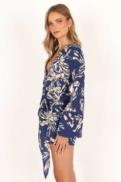 | DETAILS This gorgeous number features a mini length, overlay neckline and long flared sleeves. The back of the dress has an invisible zip for easy closure, and it also comes with an attached faux wrap skirt that ties at the close.