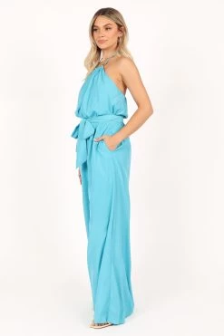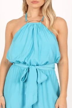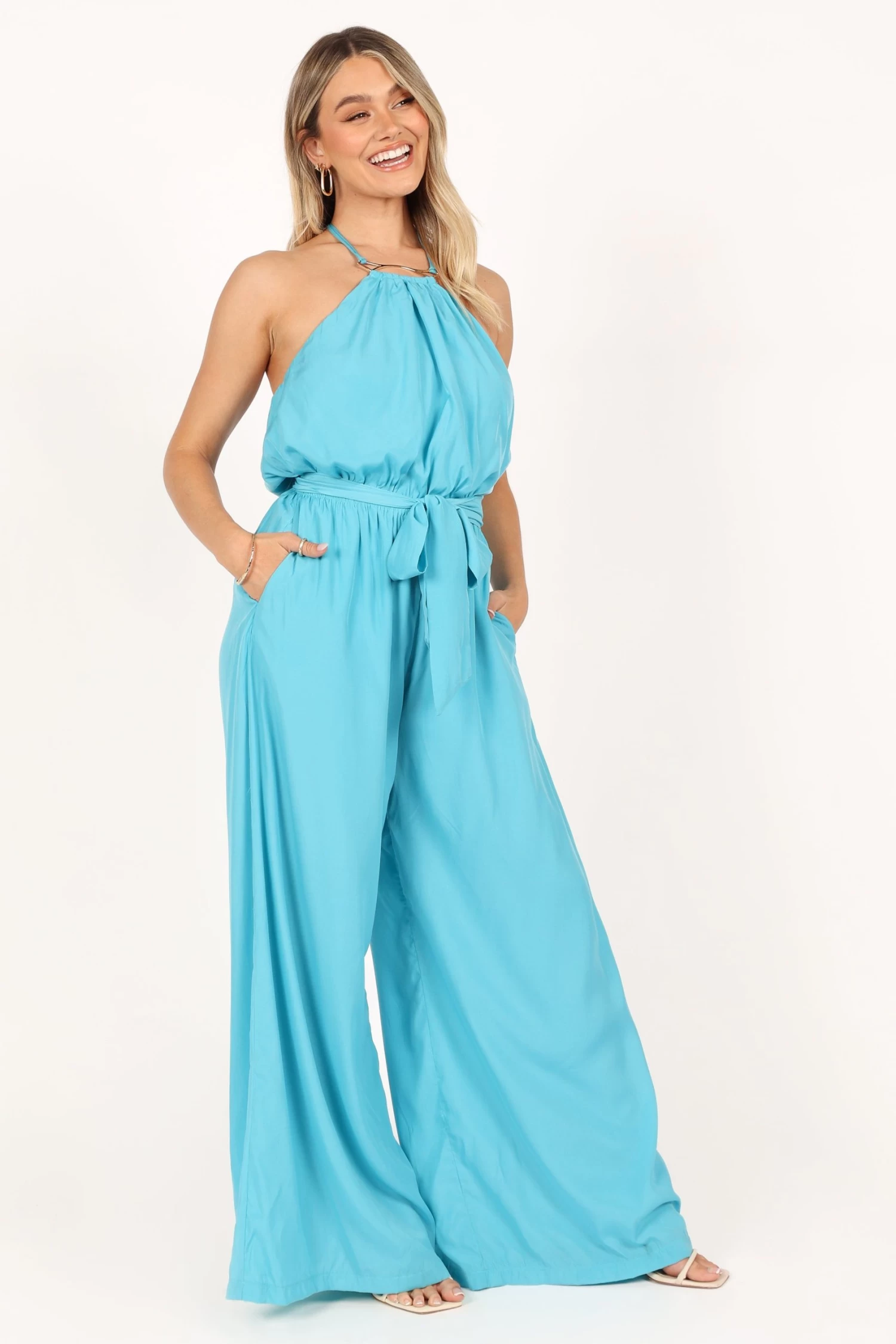 | DETAILS Dazzle at your next party in this halter jumpsuit! With an eye-catching halter neckline, this jumpsuit features gold hardware details and a detachable waist tie to customize the look to fit your style.
