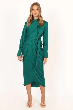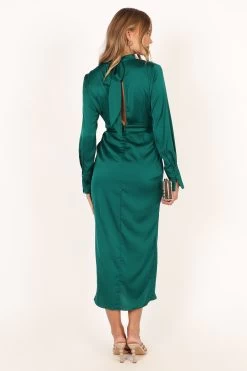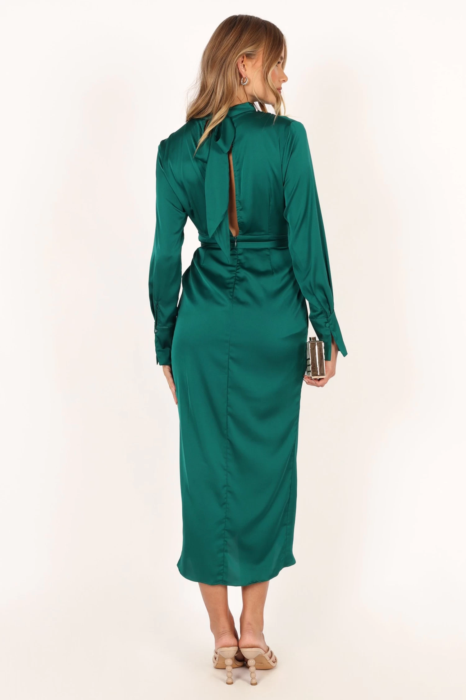 | DETAILS Are you looking for the perfect dress to wear for an event? Look no further than this gorgeous midi dress! The high mock neckline is finished with a tie close, giving it a unique and feminine style.