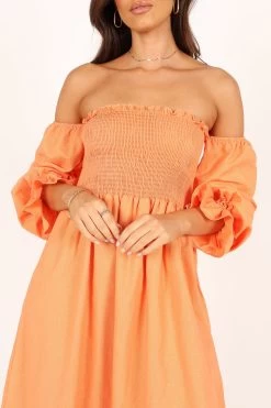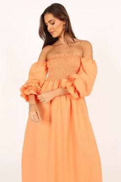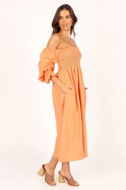 | DETAILS This off shoulder midi dress is an easy-to-wear piece that will keep you feeling feminine and elegant. The long sleeves feature elasticised shoulders, complete with a ruffle cuff for added charm. The shirred bodice ensures a comfortable fit, while the functional pockets provide extra convenience.
