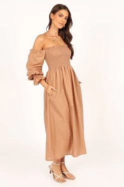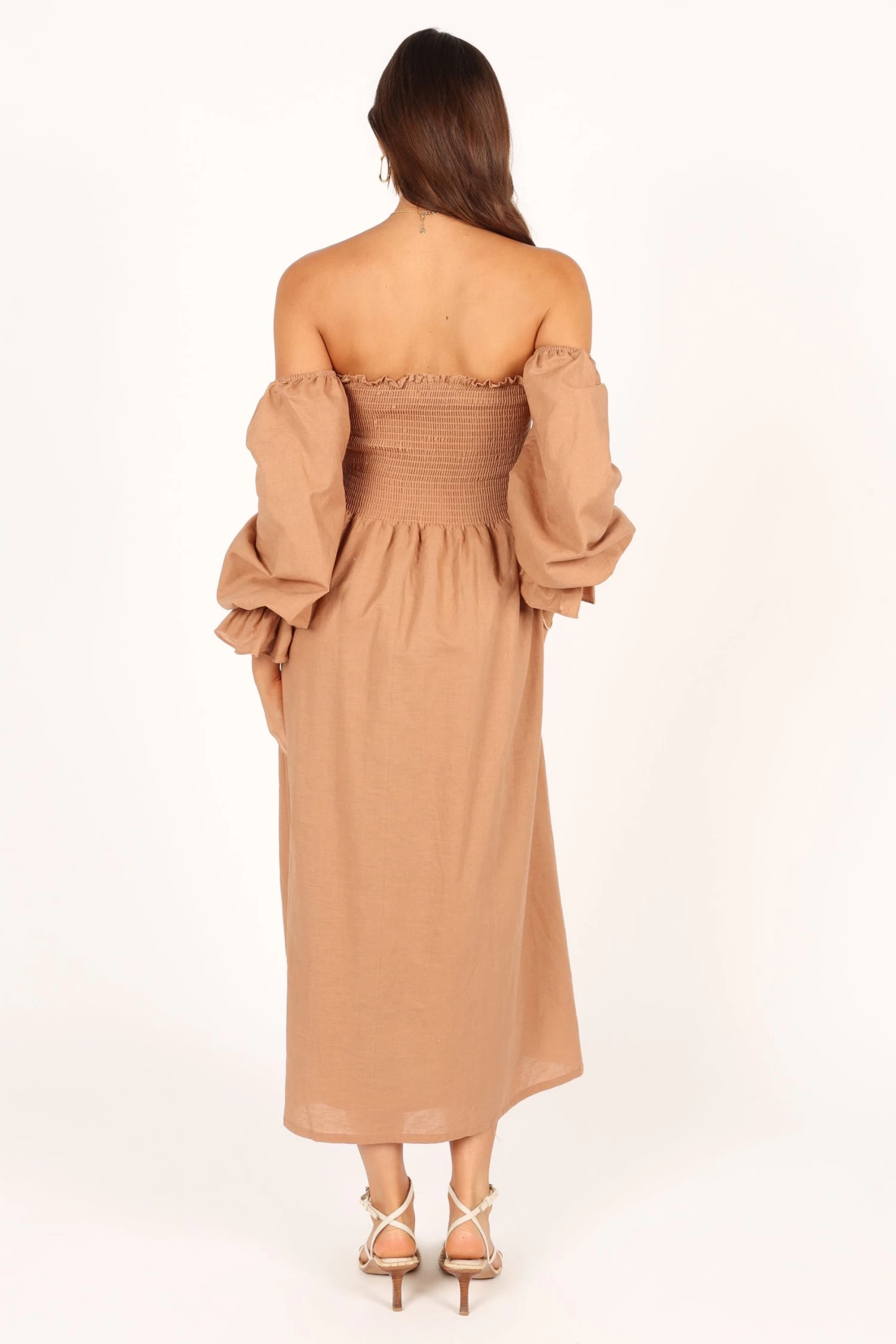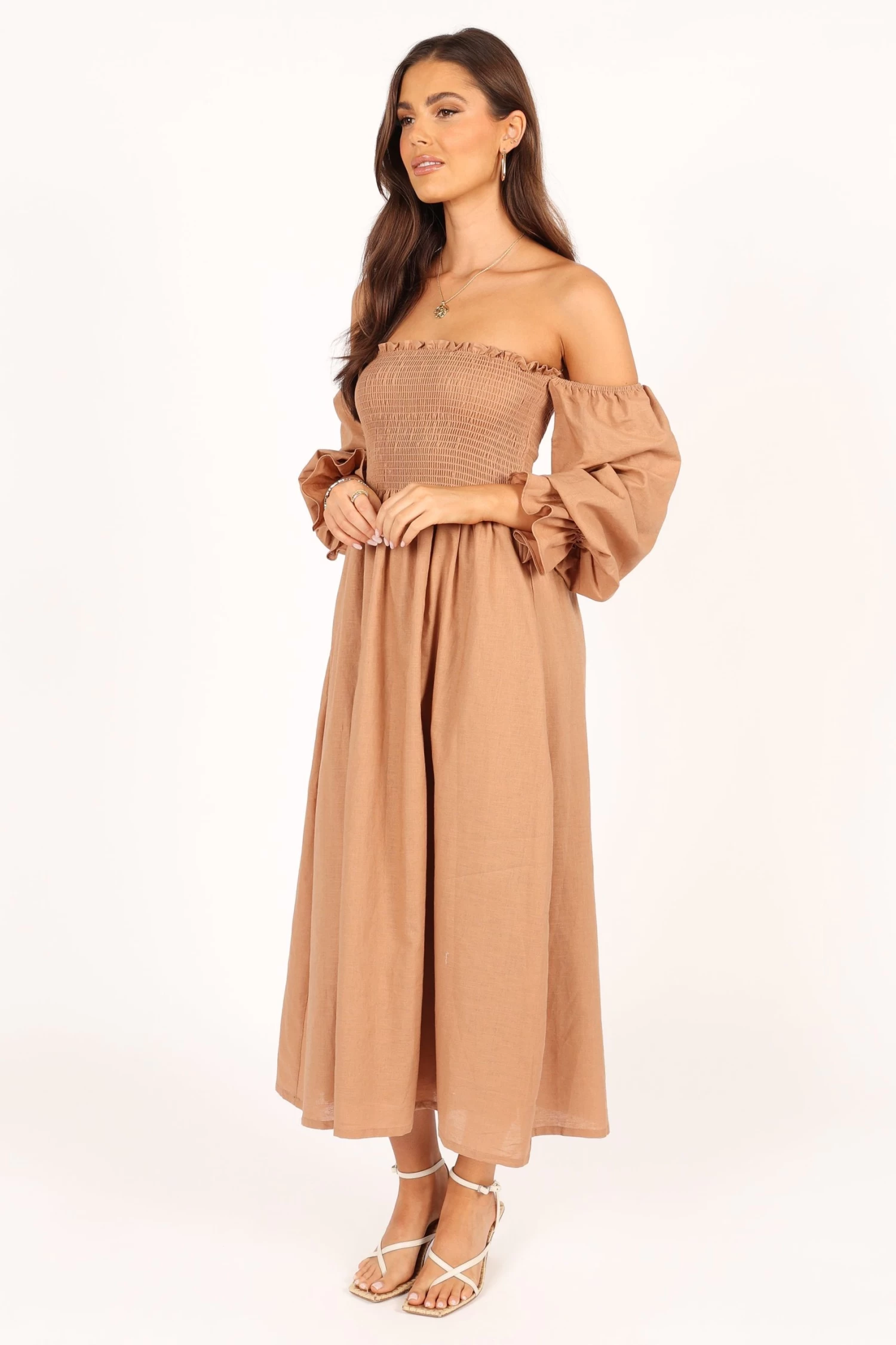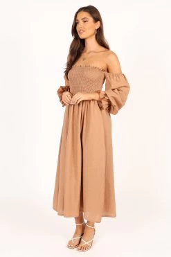 Domenica Shirred Long Sleeve Midi Dress – Tan