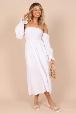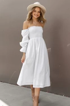 | DETAILS This off shoulder midi dress is an easy-to-wear piece that will keep you feeling feminine and elegant. The long sleeves feature elasticised shoulders, complete with a ruffle cuff for added charm. The shirred bodice ensures a comfortable fit, while the functional pockets provide extra convenience.