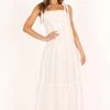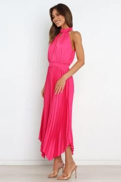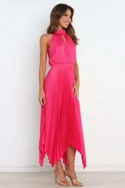 | DETAILS The Dominique is an elegant halter dress with a handkerchief hemline and cut outs for a touch of fun. Shirring creates a stunning silhouette, while the button close front means it’s easily worn. Perfect for date night or special events, the fine pleats and satin finish will have you feeling stylish.