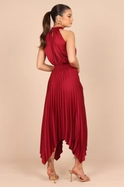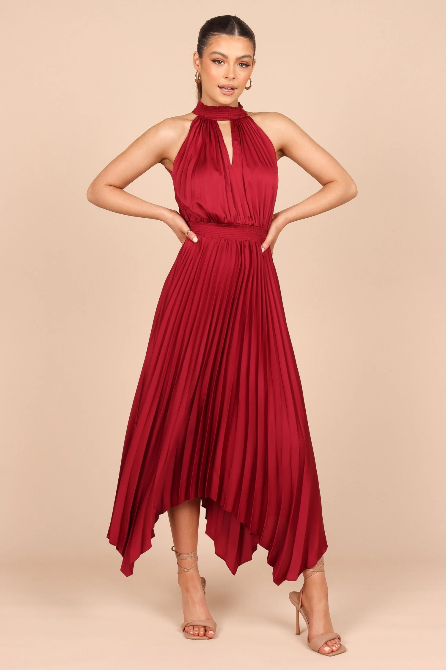 | DETAILS The Dominique is an elegant halter dress with a handkerchief hemline and cut outs for a touch of fun. Shirring creates a stunning silhouette, while the button close front means it’s easily worn. Perfect for date night or special events, the fine pleats and satin finish will have you feeling stylish.