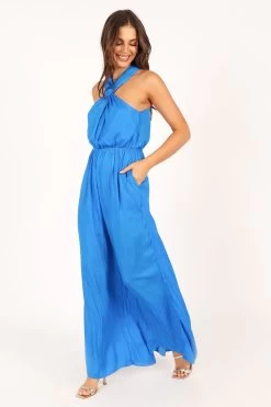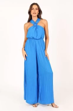 | DETAILS Feel glamorous and flirty in this beautiful halter style jumpsuit. The crossover neckline is adorned with a delicate resin feature, adding a touch of sparkle to the look. Reveal just enough skin with the open back, which fastens securely with a button closure.