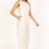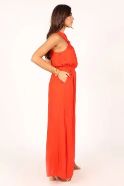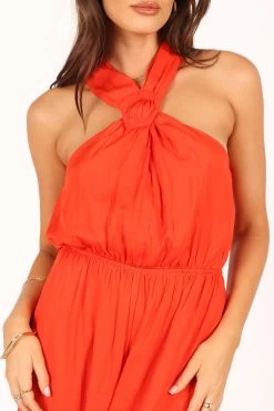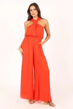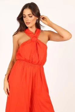 | DETAILS Feel glamorous and flirty in this beautiful halter style jumpsuit. The crossover neckline is adorned with a delicate resin feature, adding a touch of sparkle to the look. Reveal just enough skin with the open back, which fastens securely with a button closure.