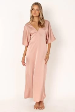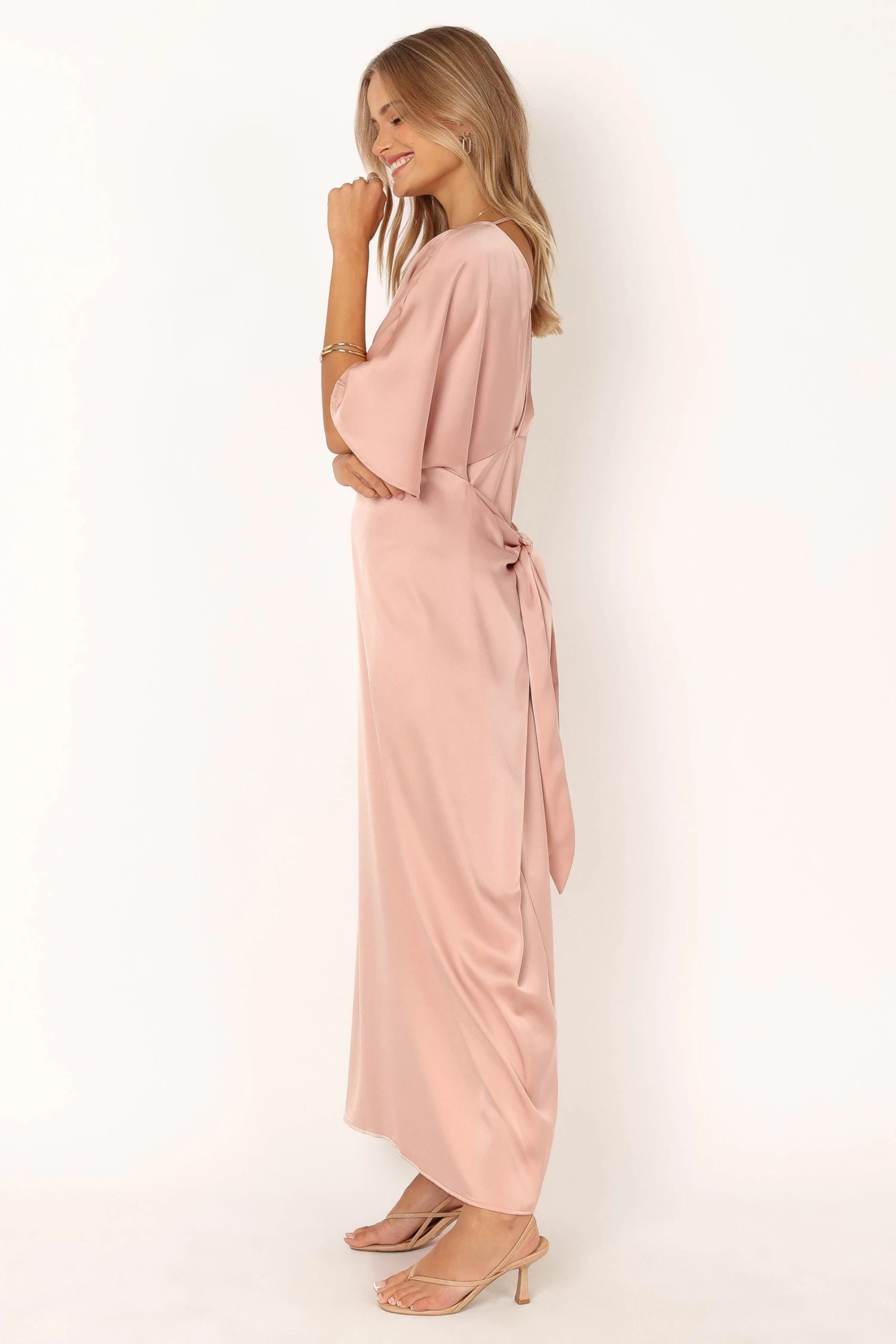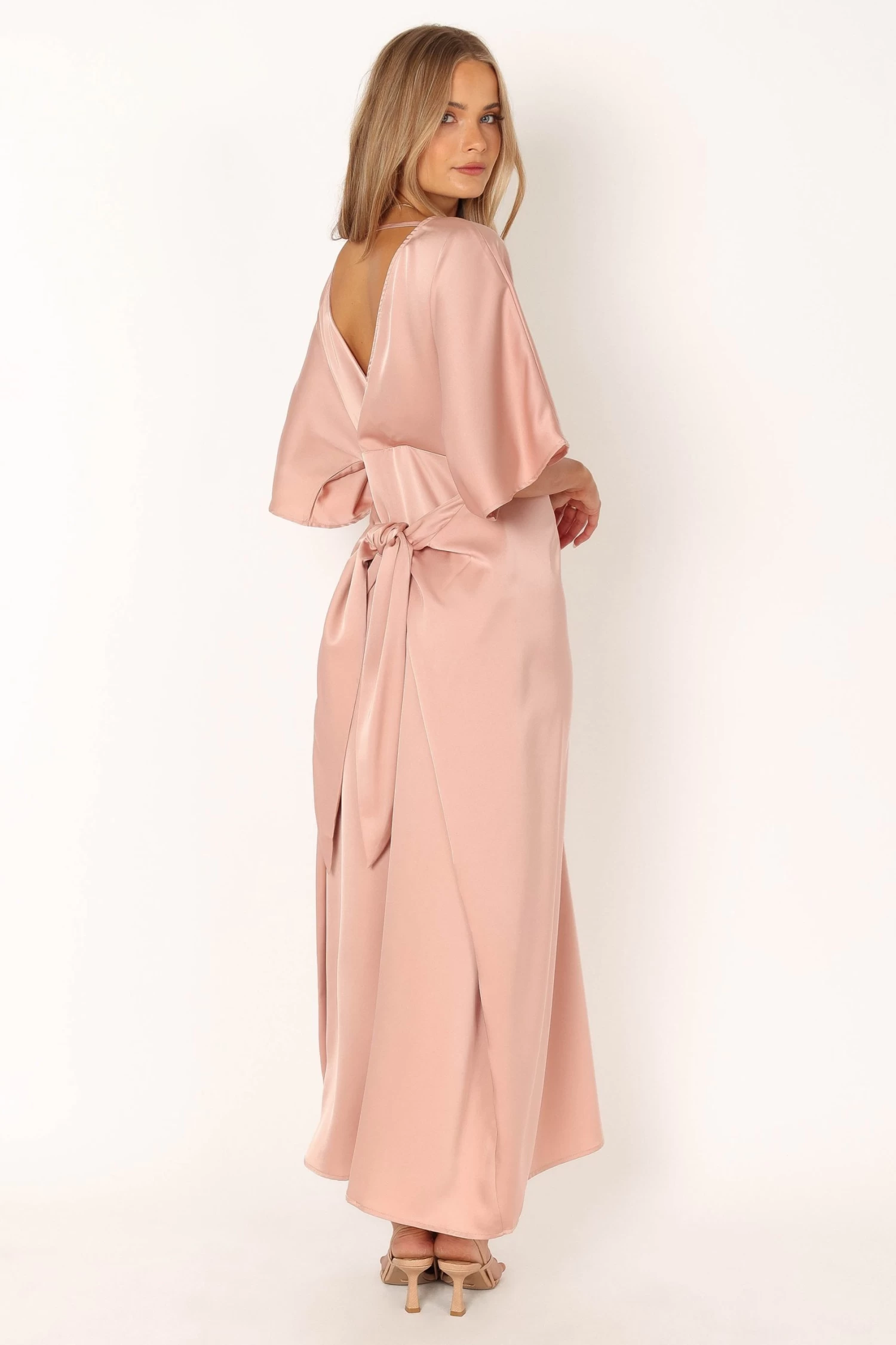 | DETAILS The perfect thing for your special occasion, this maxi dress will be sure to turn heads. Featuring a v neckline, short sleeves and back cut out detail for a contemporary touch, the attached waist tie adds an elegant finishing touch.