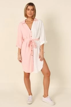 | DETAILS Introducing the must-have shirt style dress of the season! This above knee length dress features a v neckline and collared detail for an effortlessly chic look. The mid length sleeves with roll cuff give it a modern touch, while functional buttons down the front add to its classic charm.