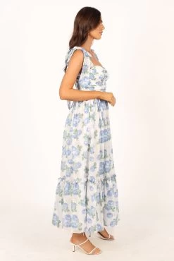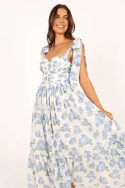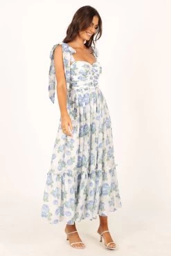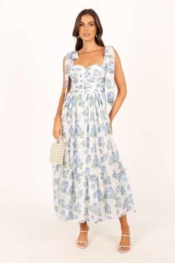 | DETAILS Make a statement in this dreamy dress! This midi dress features a sweetheart neckline, tie close shoulder straps, and padded cups in the bust for extra support and to top it all off, this dress is made with a blue floral chiffon overlay for an elegant touch. Perfect for any special occasion.