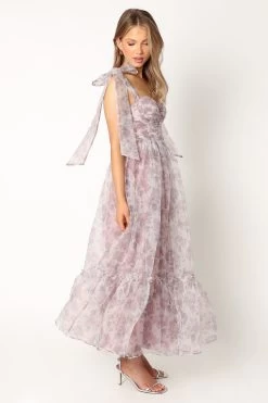 | DETAILS Make a statement in this dreamy dress! This midi dress features a sweetheart neckline, tie close shoulder straps, and padded cups in the bust for extra support and to top it all off, this dress is made with a purple floral chiffon overlay for an elegant touch. Perfect for any special occasion.