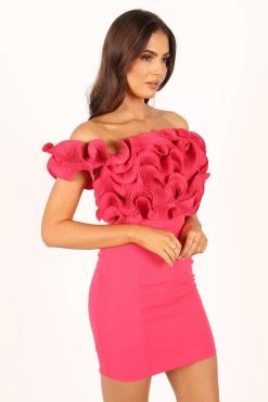 | DETAILS This striking hot pink off-shoulder dress is perfect for achieving an elegant and fashionable look at parties and special occasions. The mini length design beautifully accentuates your legs, while the structured ruffle feature on the bust adds a sophisticated and stylish touch.