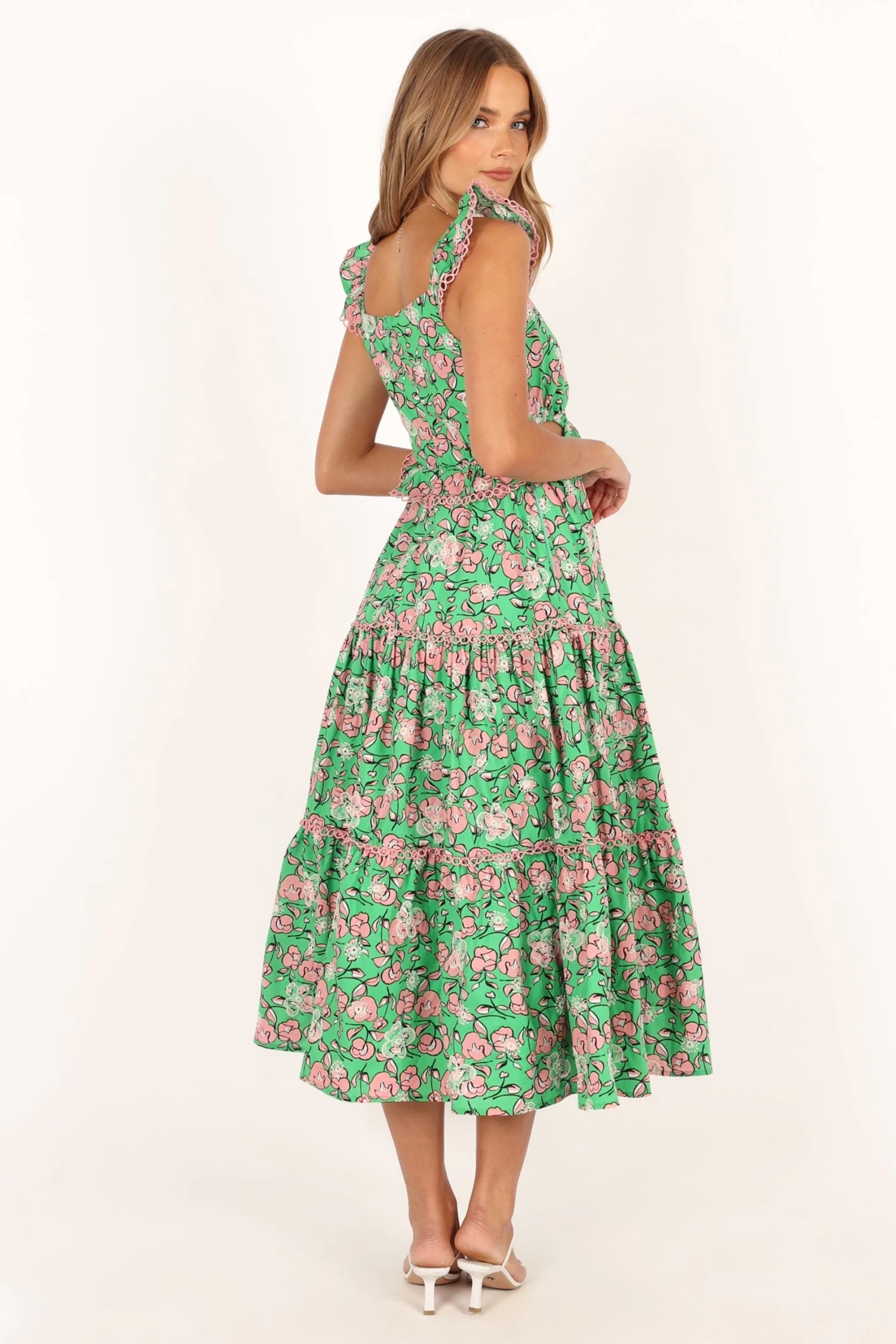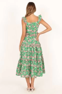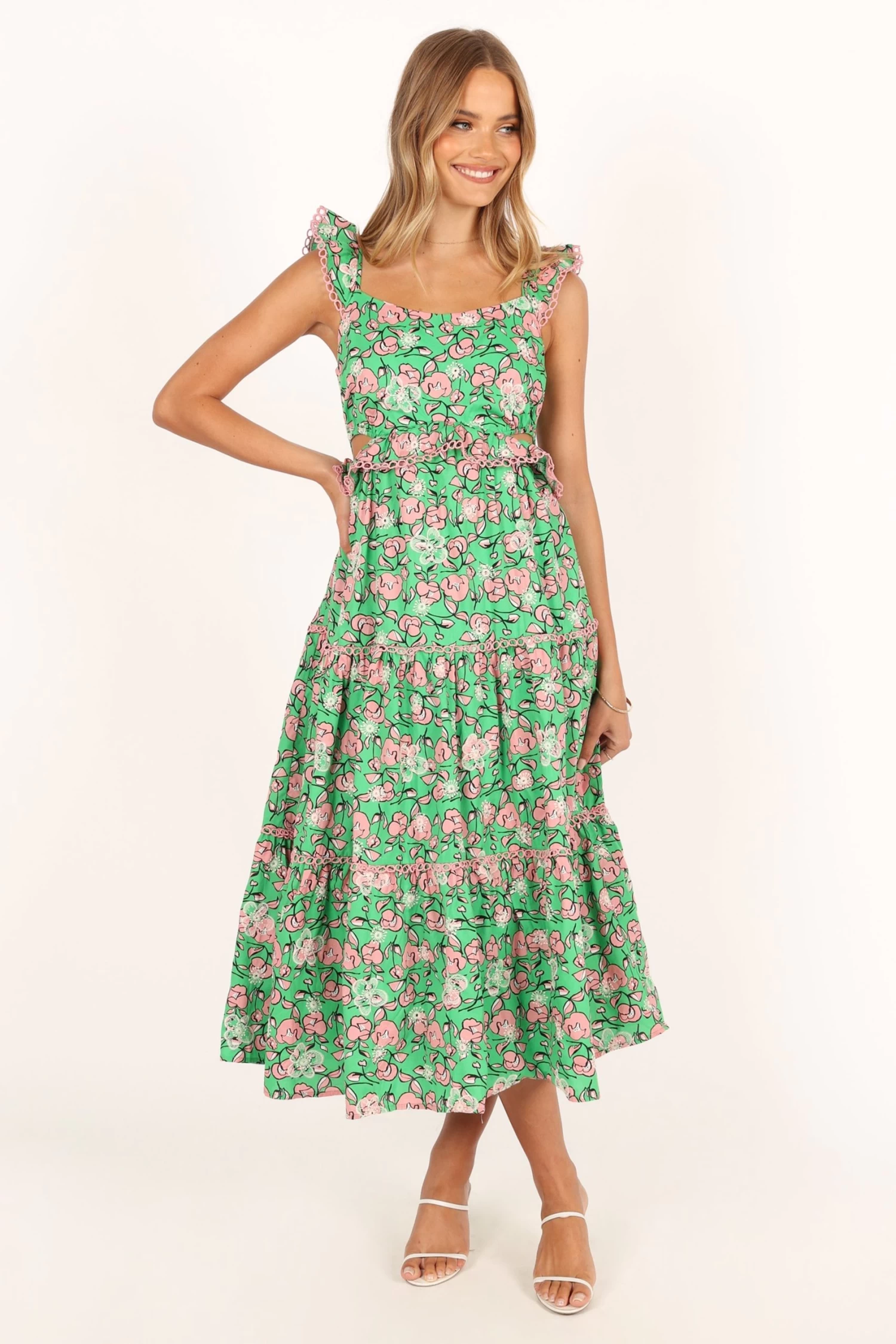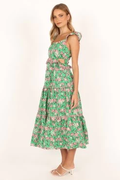 | DETAILS This exquisite midi length dress features a lovely pink floral print, perfect for making a statement during spring and summer events. The square neckline adds a touch of elegance while the ruffled shoulder strap detail brings a playful and feminine touch to the overall design.