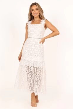 | DETAILS This midi-length dress is the perfect way to show off your fun and feminine party style! The square neckline and thick, non-adjustable straps will keep you comfortable while dancing the night away. And with a lace overlay, it’s sure to add a touch of glamour to any event.