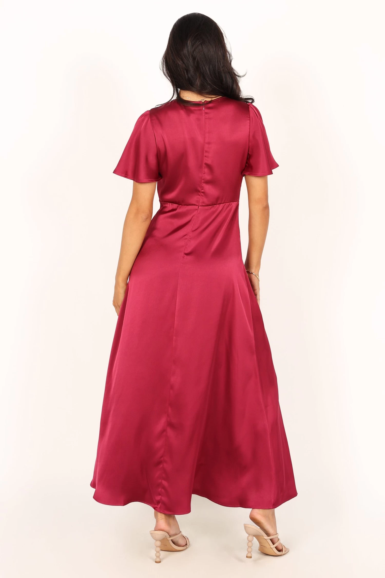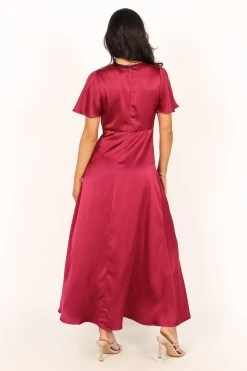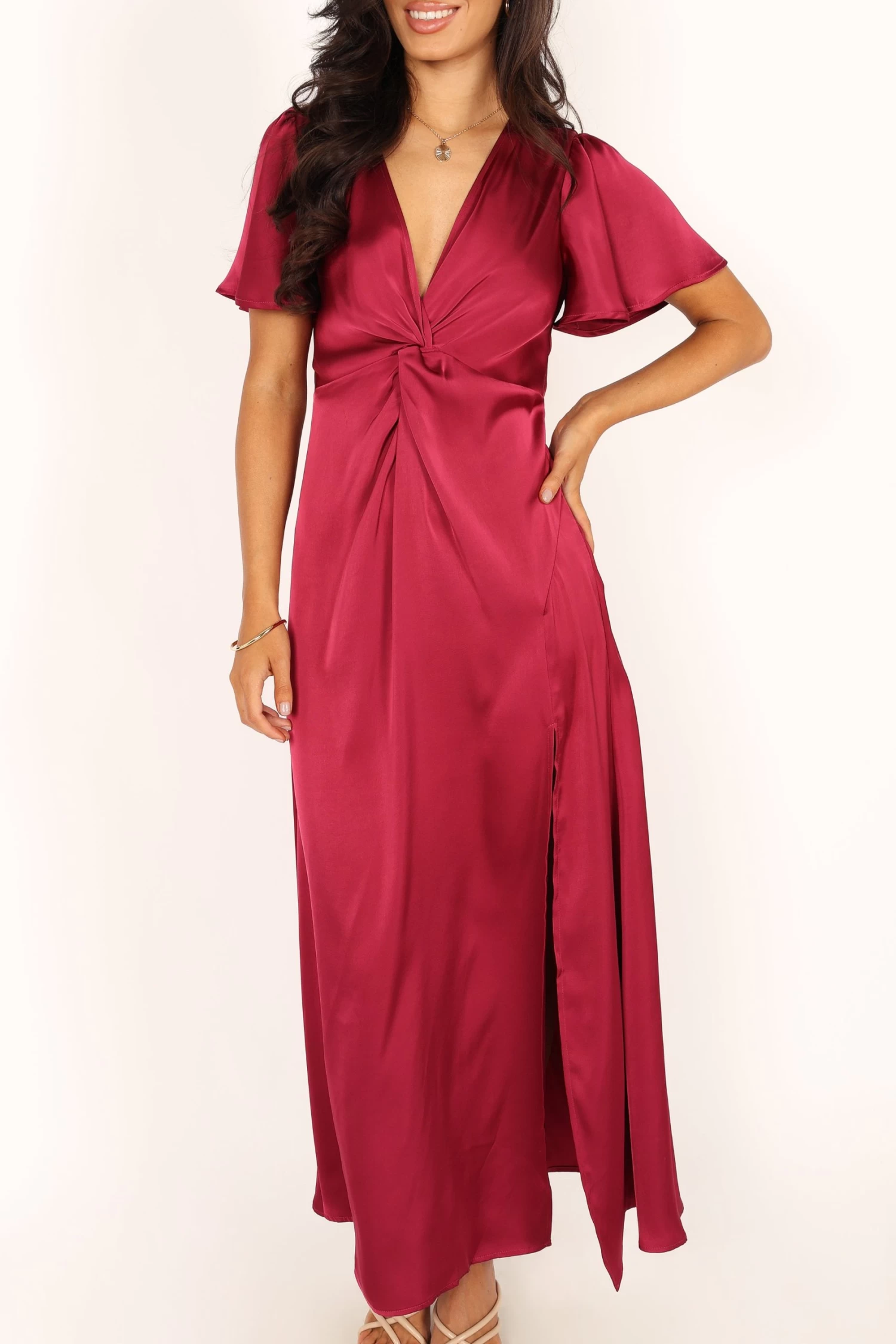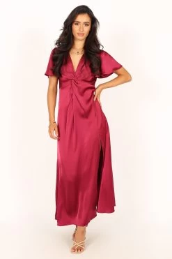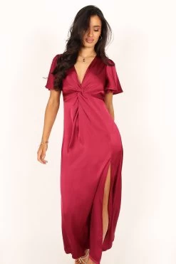 | DETAILS Introducing the Berry Knot Midi Dress. This beautiful midi length dress features a V-neckline with short sleeves and knot bust feature for a flattering silhouette.