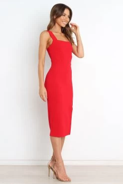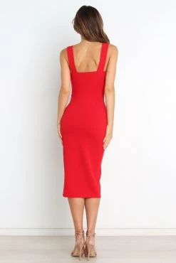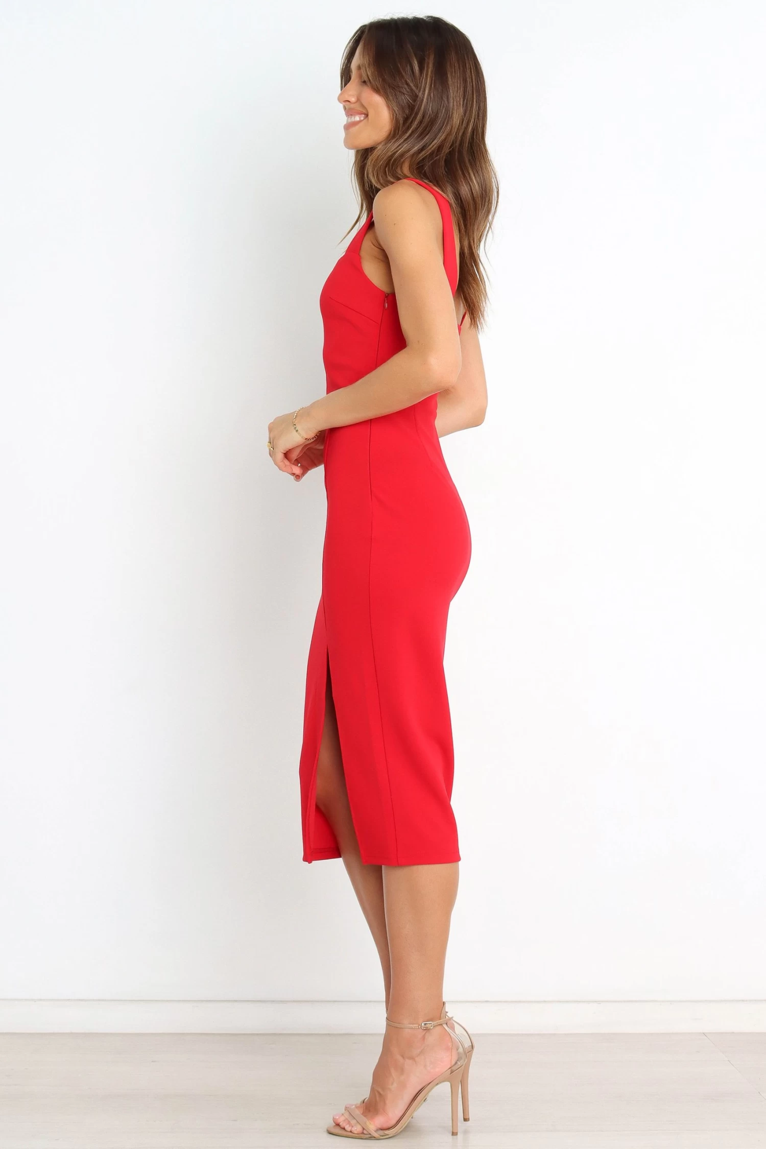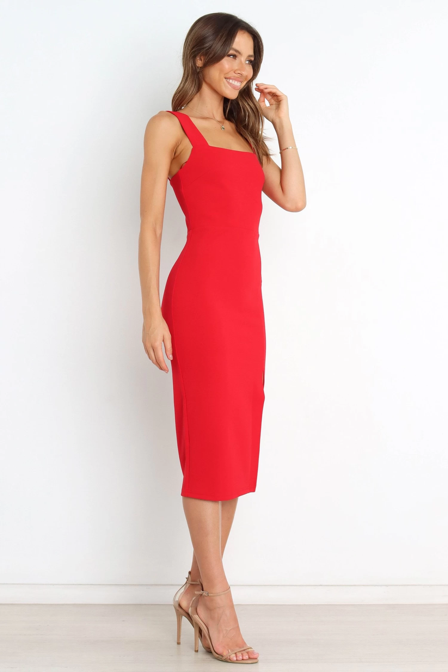 | DETAILS The Hyatt Dress is perfect for any special occasion. The style falls to a midi length with a front slit, creating a stunning silhouette that is sure to turn heads. Pair it with your favorite heels and purse!