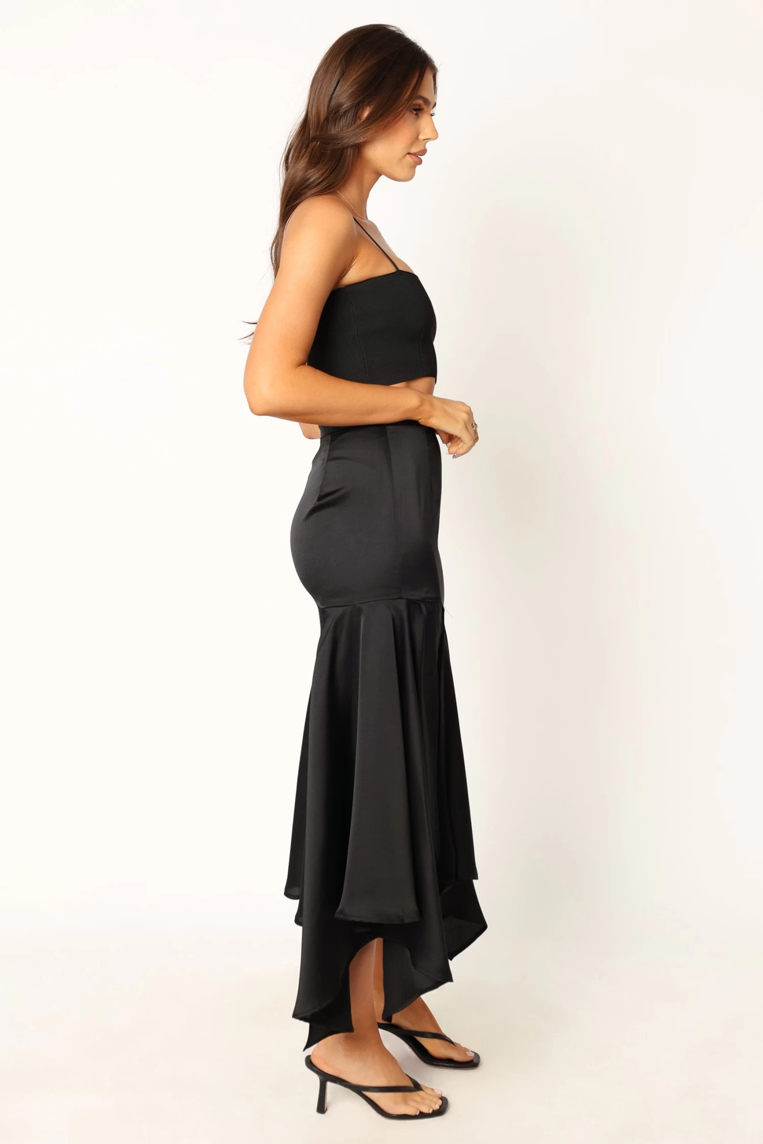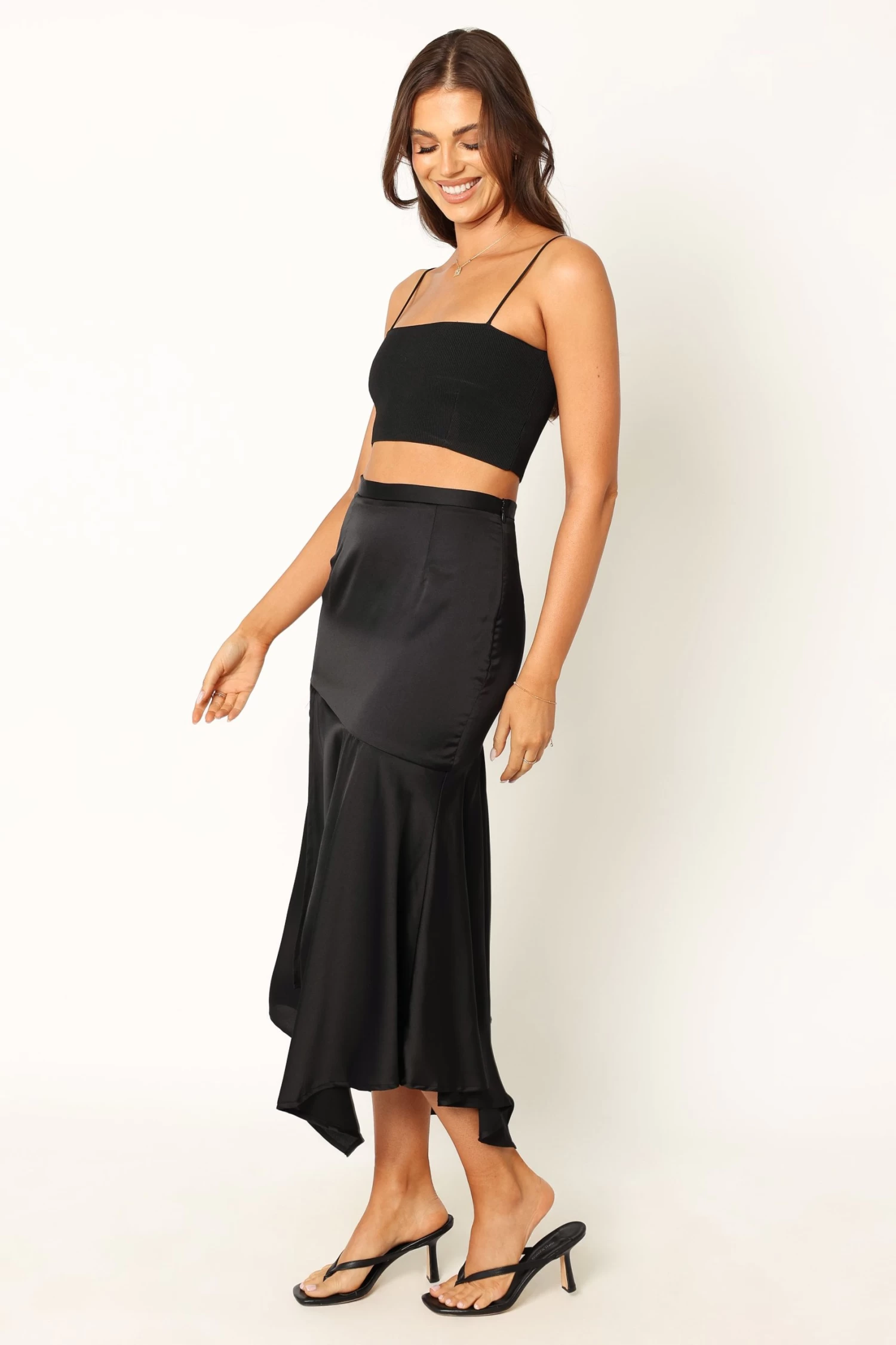 | DETAILS Add a touch of elegance to your wardrobe with this midi length skirt. Crafted from soft satin, it is sure to be an instant classic. It features an invisible side zip for easy wearing and secure closure, plus a hook and eye clasp.