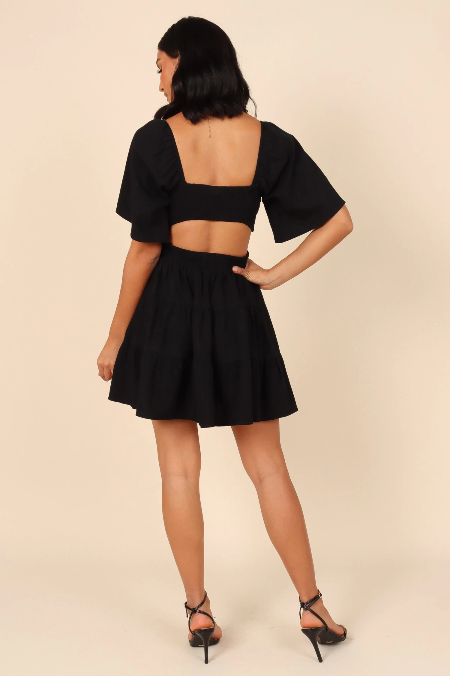 | DETAILS This party dress is the perfect pick for a fun-filled night of dancing and celebrations! With an above knee length, square neckline, short sleeves, back shirred panel and front twist design, you’ll look your best in this stunning ensemble.Â